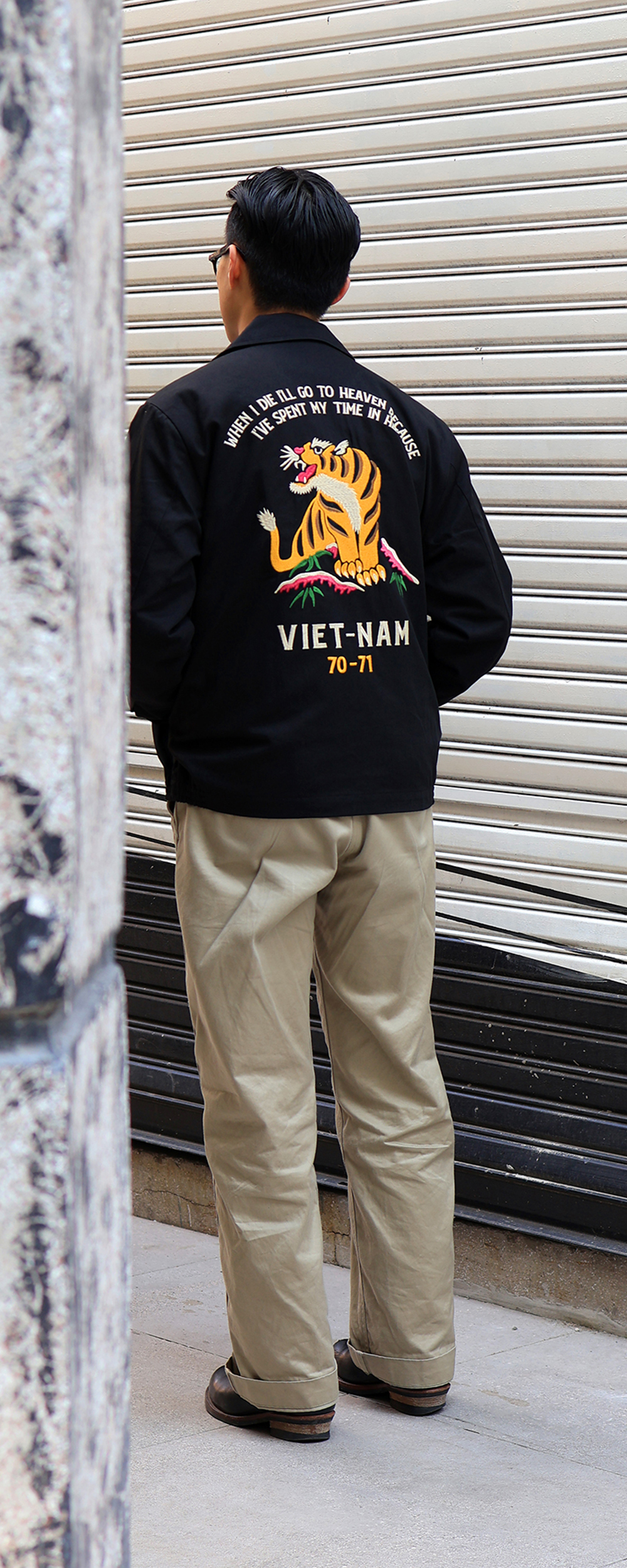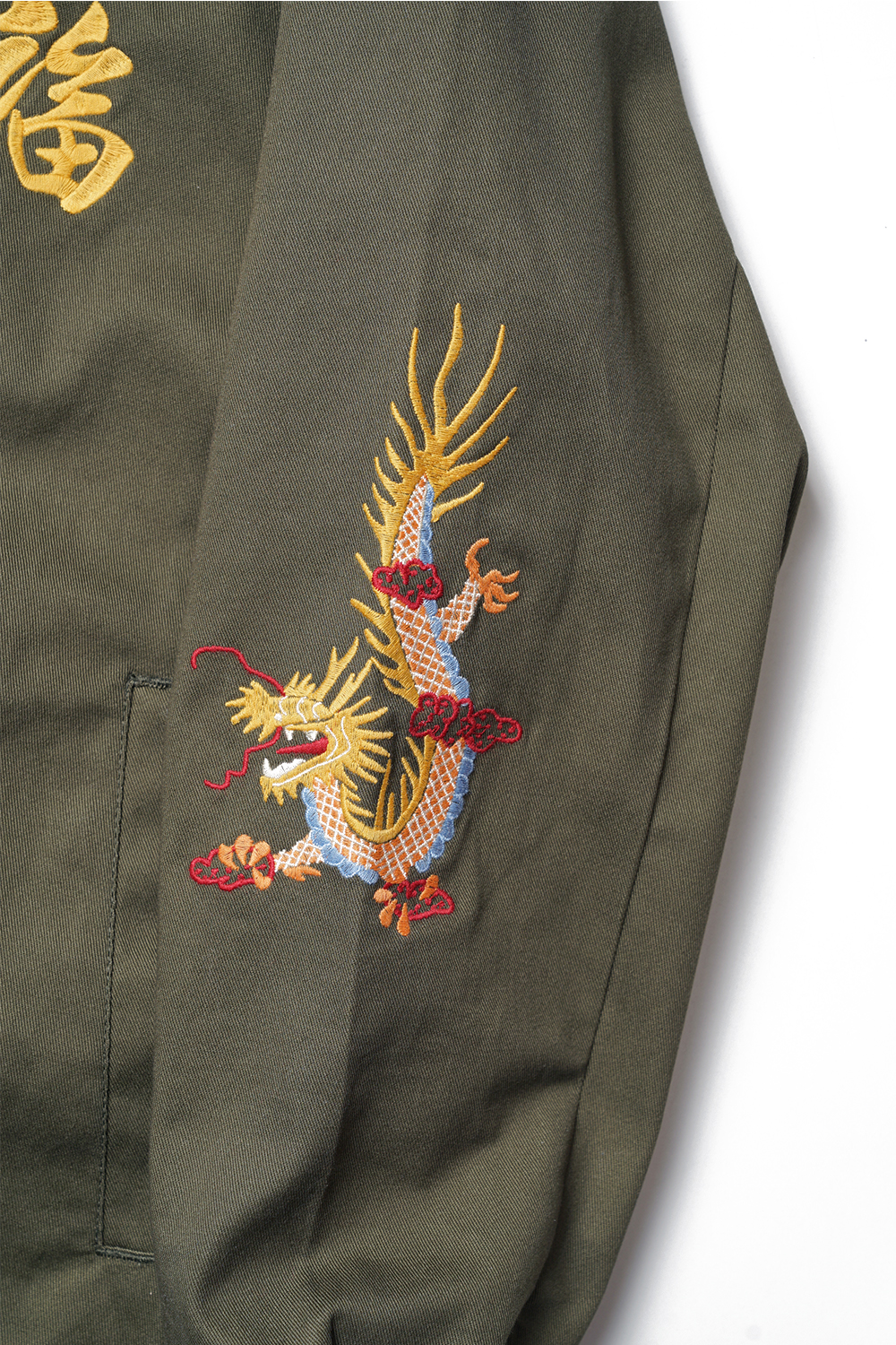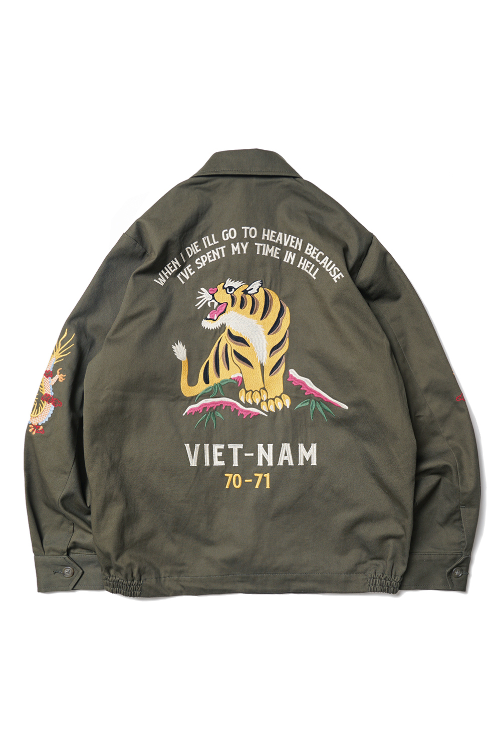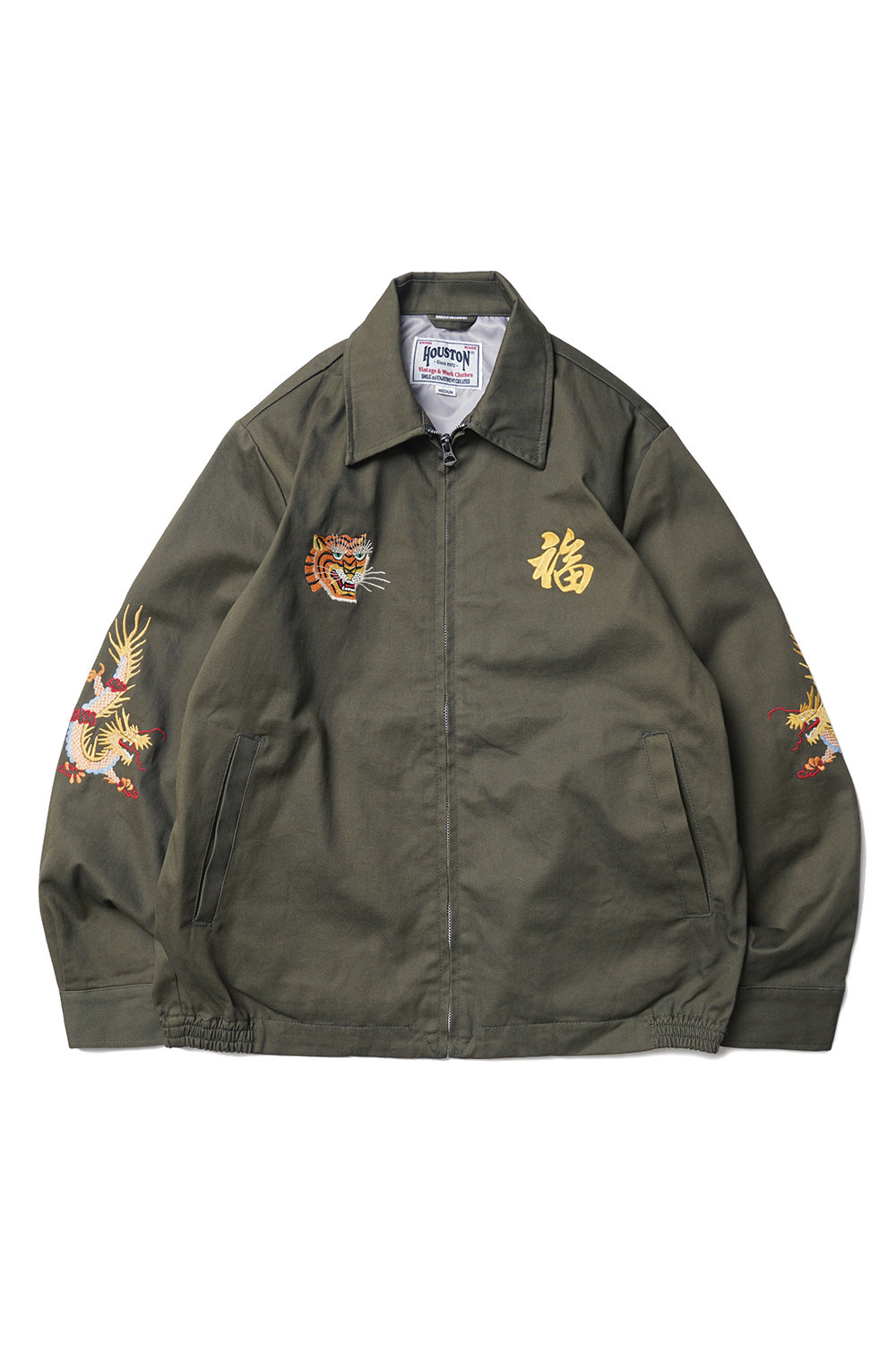 Houston Japan 51350 Cotton Vietnam Jacket (Tiger) - Olive Drab 화려한 컬러감의 코튼 능직을 사용하여 제작된 베트남 자켓입니다. 프론트는 집업 사양이며, 가슴의 양측으로 호랑이의 얼굴과 한자 복(福)이 자수되어 있습니다. 소매 역시 용의 자수가 디자인 되어 있으며, 싱글 버튼의 소맷단은 롤업에 용이합니다. 양측의 슬레쉬 포켓과 내부 좌측의 포켓이 있어 수납에 용이합니다. 후면부의 중앙에는 큰 형태의 호랑이 자수가 되어 있습니다.