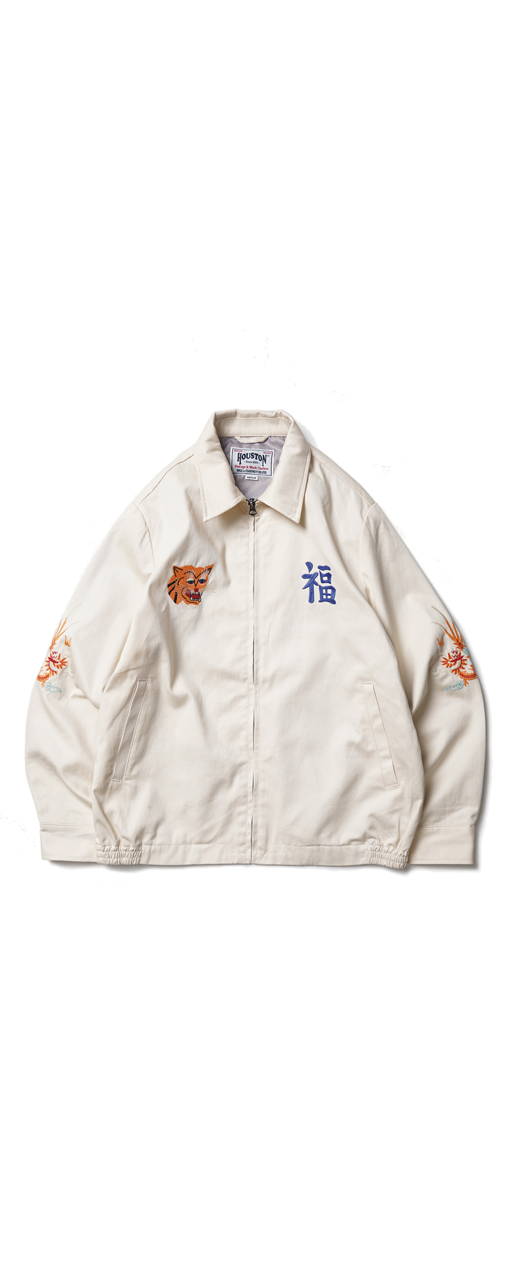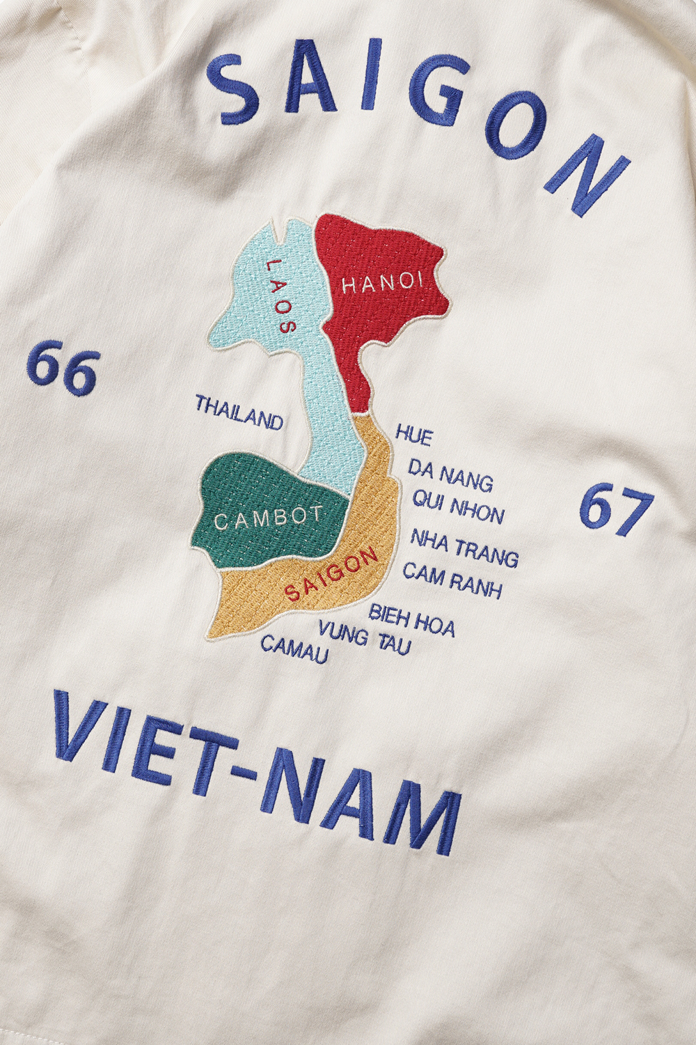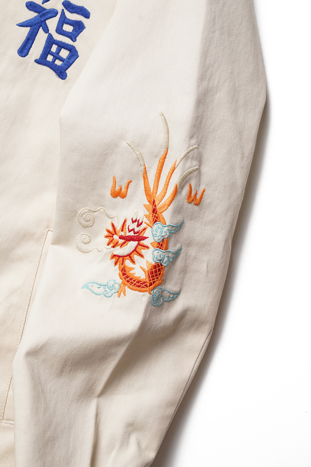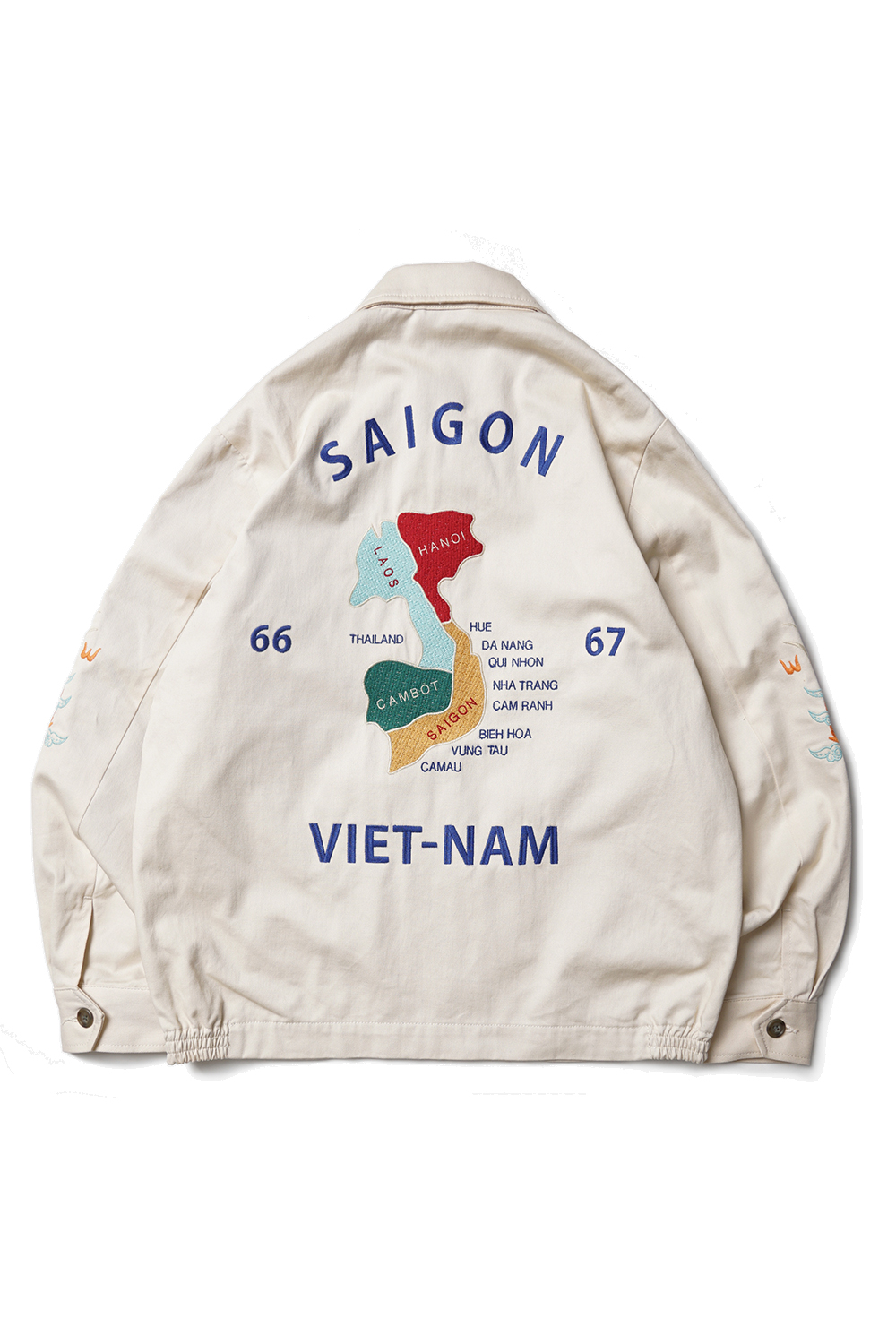 Houston Japan 51351 Cotton Vietnam Jacket (Map) - Off White 화려한 컬러감의 코튼 능직을 사용하여 제작된 베트남 자켓입니다. 프론트는 집업 사양이며, 가슴의 양측으로 호랑이의 얼굴과 한자 복(福)이 자수되어 있습니다. 소매 역시 용의 자수가 디자인 되어 있으며, 싱글 버튼의 소맷단은 롤업에 용이합니다. 양측의 슬레쉬 포켓과 내부 좌측의 포켓이 있어 수납에 용이합니다. 후면부의 중앙에는 큰 형태의 지도가 자수가 되어 있습니다.