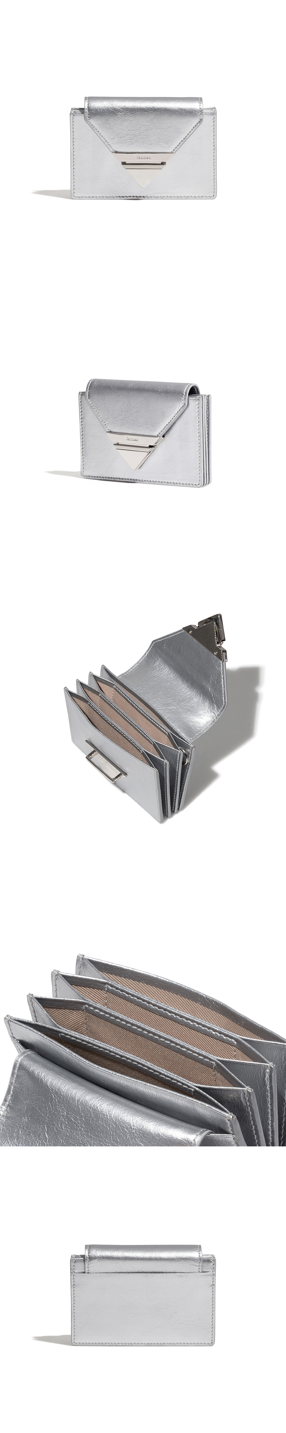 - new 트라이앵글 푸시형 개발 장식을 적용한 월렛 - 은은한 광택감과 자연스러운 크랙 텍스처의 크링클 소가죽 소재 - 로고가 각인된 니켈사틴 장식 포인트 - 3개의 아코디언 슬롯으로, 카드, 명함, 지폐 등 분리 수납에 용이 - D링을 활용하여 키링, 체인 스트랩 등으로 다양한 연출 가능