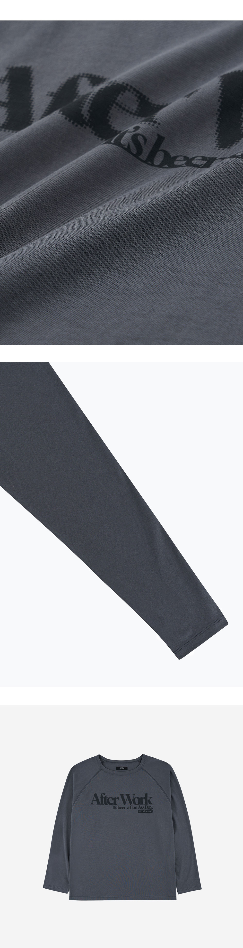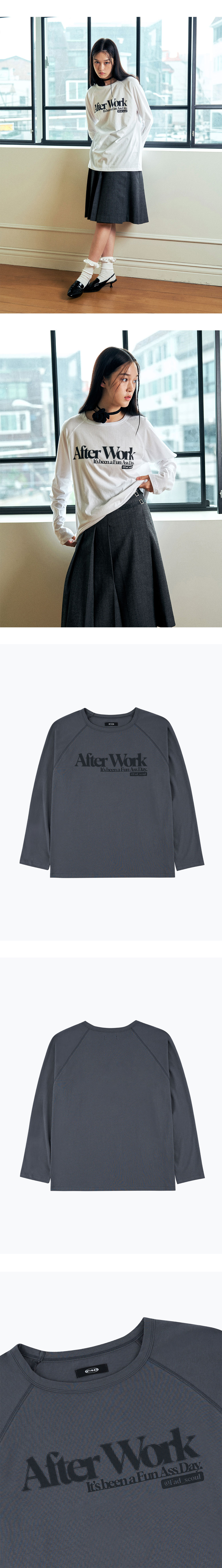 After work 시즌슬로건을 하프톤 방식의 그래픽 작업으로 구현, 30s 코튼의 적당한 두께감의 핏으로 활용도 높은 스타일링