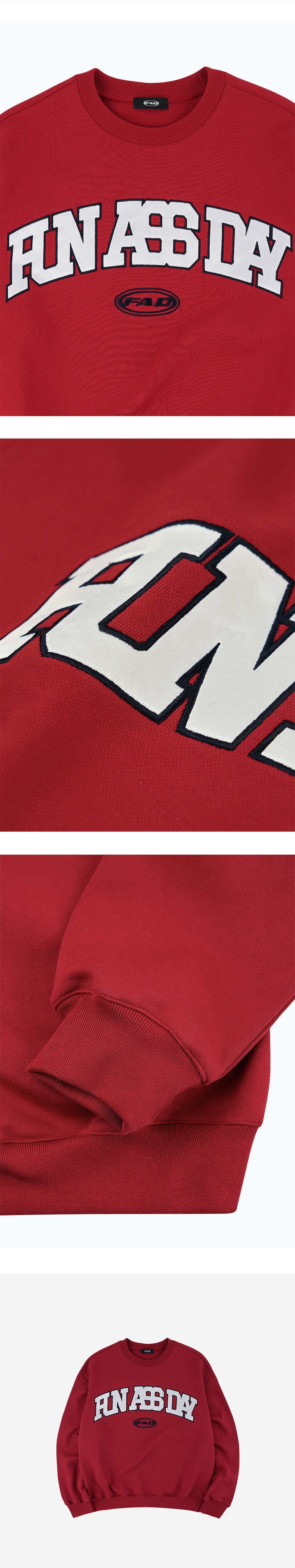새틴 소재를 활용하여 아플리케 자수 작업을 진행한 FAD 오리지널 스웻셔츠, 밀도감 있는 French Terry 소재를 사용한 단단한 핏감, 빈티지한 소재감위에 글로시한 자수가 매력