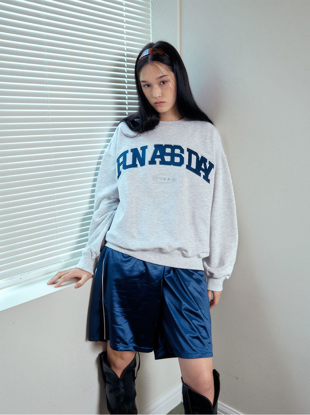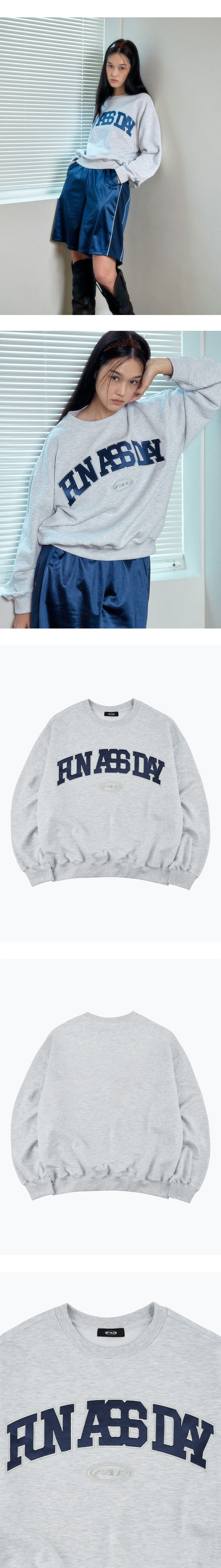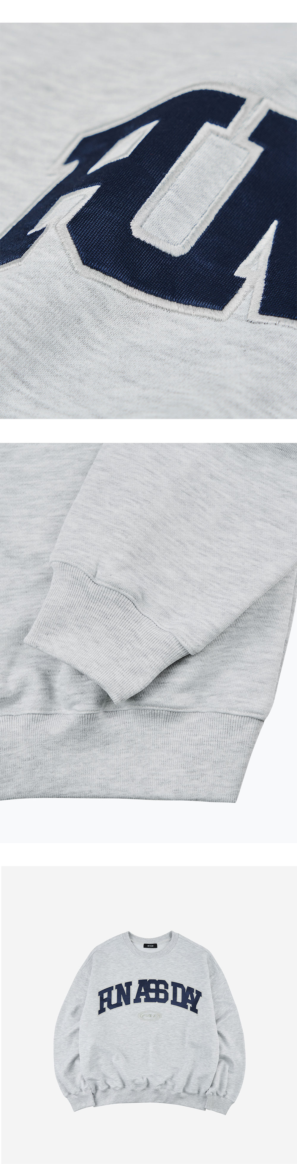 새틴 소재를 활용하여 아플리케 자수 작업을 진행한 FAD 오리지널 스웻셔츠, 밀도감 있는 French Terry 소재를 사용한 단단한 핏감, 빈티지한 소재감위에 글로시한 자수가 매력