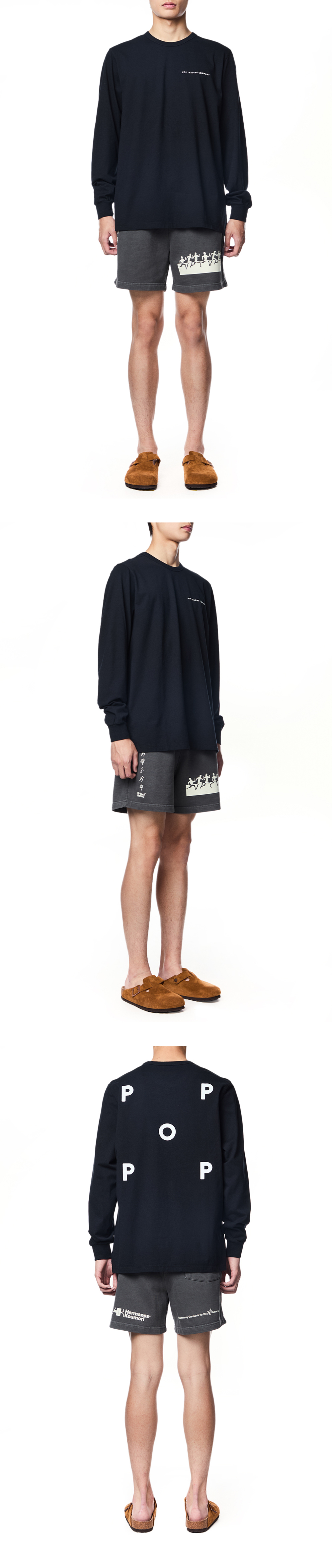- 전면에 흰색 스크립트 로고 인쇄 - 뒷면에 화이트 팝 로고 프린트 - 스티치 디테일 - 밑단 옆면 트임 - 헤링본 넥테이프 *모델 신체 스펙 : 185cm / 착용 사이즈 : L