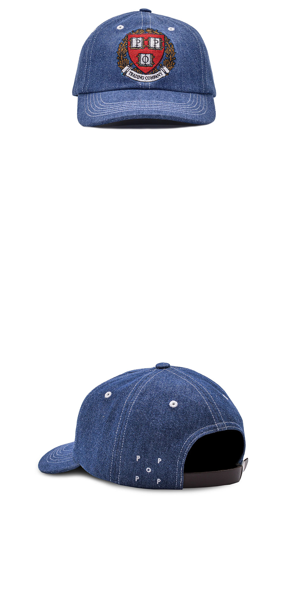 - 화이트 콘트라스트 스티치 - 653 야구 스타일 바이저 - 내부 검정색 스웨트 밴드 - 금속 프레스 버클이 달린 브라운 가죽 스트랩 잠금장치 - 전면에 팝 문장 자수 - 왼쪽 뒷면에 화이트 자수 팝 로고