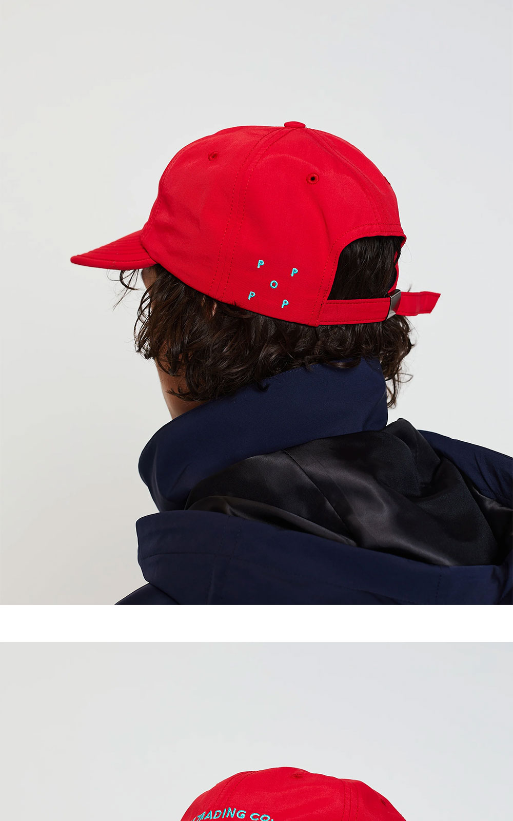 - 플랫 폼 챙 - 내부에 검정색 스웨트 밴드 - 금속 프레스 버클이 있는 자체 패브릭 잠금장치 - 전면에 피콕 그린 스크립트 로고 자수 - 왼쪽 뒷면에 피콕 그린 자수 팝 로고 - 내구성이 뛰어난 발수 마감