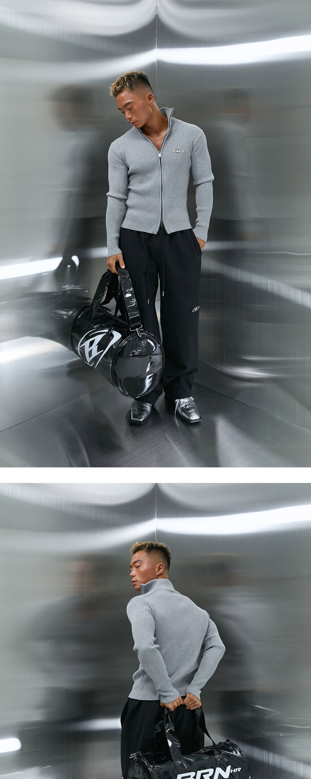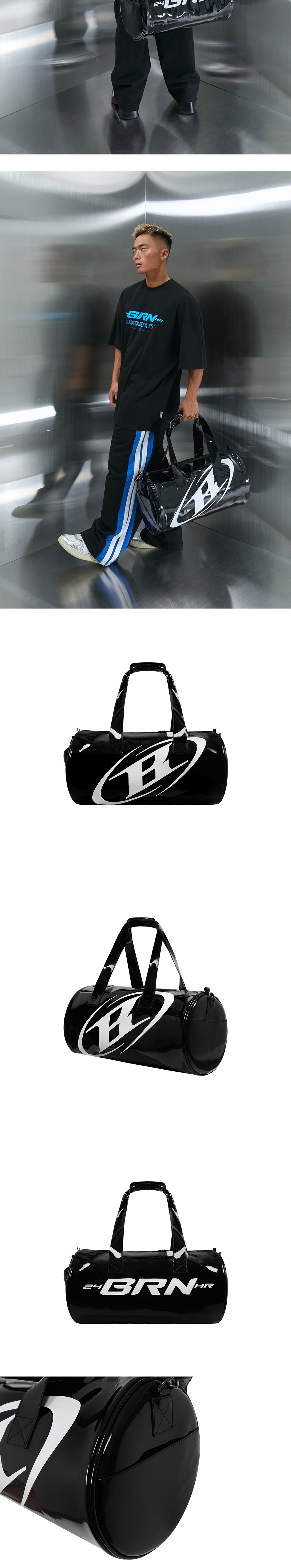 글로시 에나멜 더플백 - 30L - 양면 로고 프린트 - 2way 클로징 - 로고 참 슬라이더 - 내부 포켓