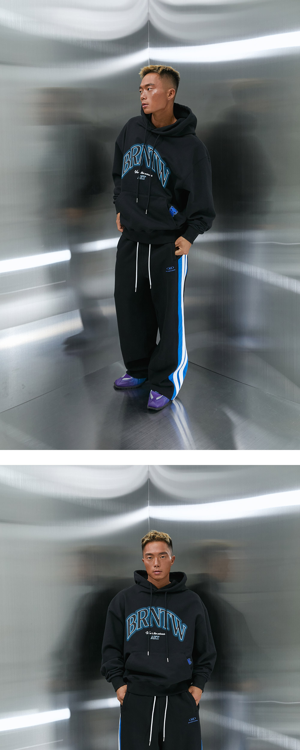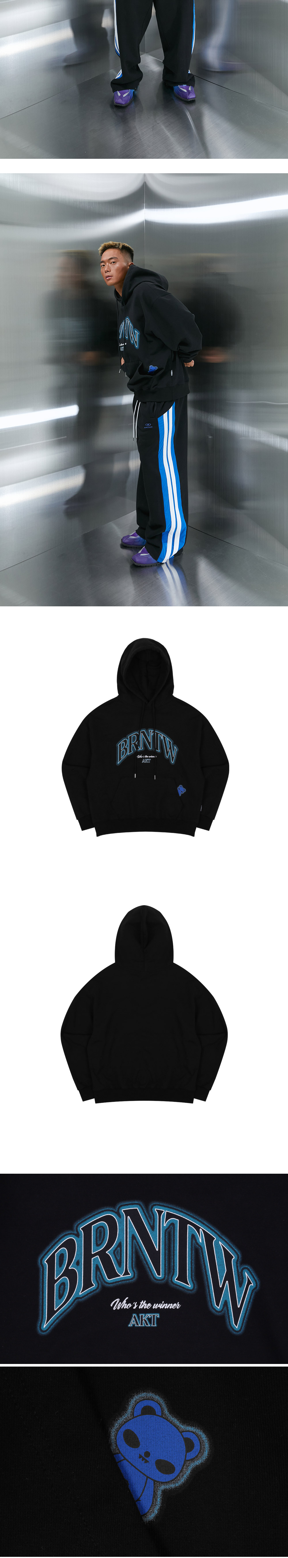 악트 오버 사이즈 핏 후디 - BRNTW 레터 프린트 - 전면 포켓 캐릭터 프린트 - 측면 러버라벨 포인트