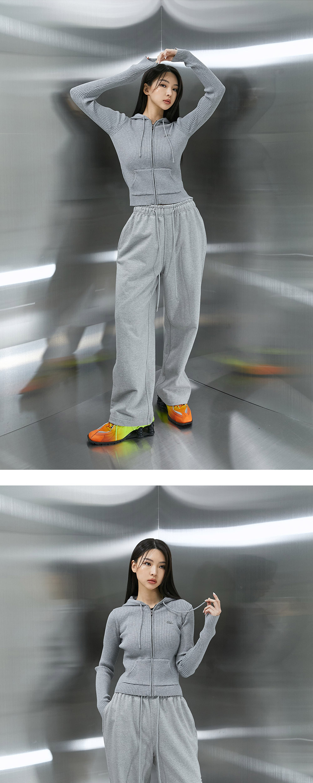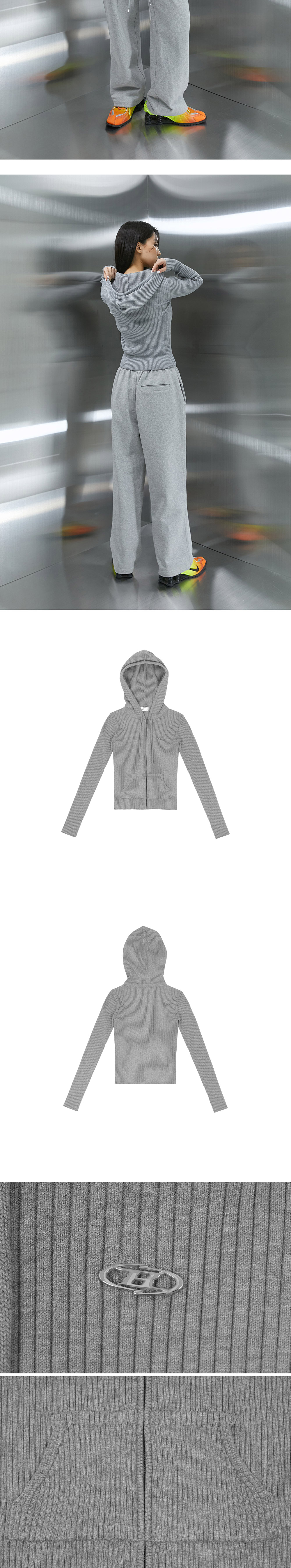 B로고 팬던트 슬림핏 골지 집업 후디 - 필링이 없는 워셔블 레이온 니트 원단 - 캥거루 주머니 - 서지컬 B로고 펜던트