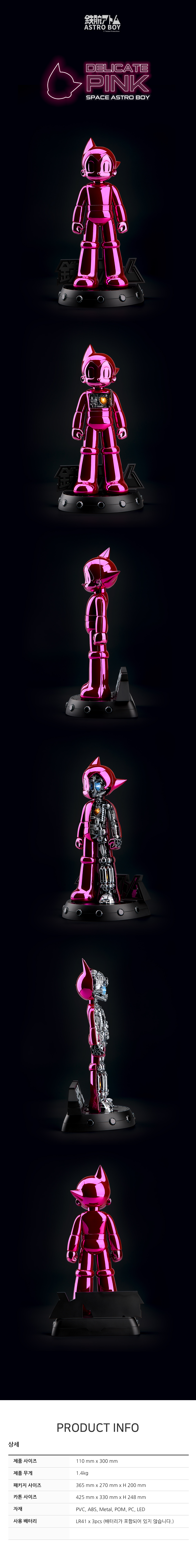 [Product Detail] Weight Approx. : 1.4kg (Product only) / 3.5kg (Including Package) Dimension Approx. – Package : W 365 mm x D 270 mm x H 200 mm – Carton : W 425 mm x D 330 mm x H 248 mm [1 pc / 1 carton] – Case Carton : W 765 mm x D 440 mm x H 345 mm [3 pcs / 1 carton] *Dimension and weight could be changed later. [Materials] – Face, Hand : PVC, PC – Body : ABS, Metal, POM, PC – Base : ABS – Equipment : LED – Package : Color Box + Styrofoam