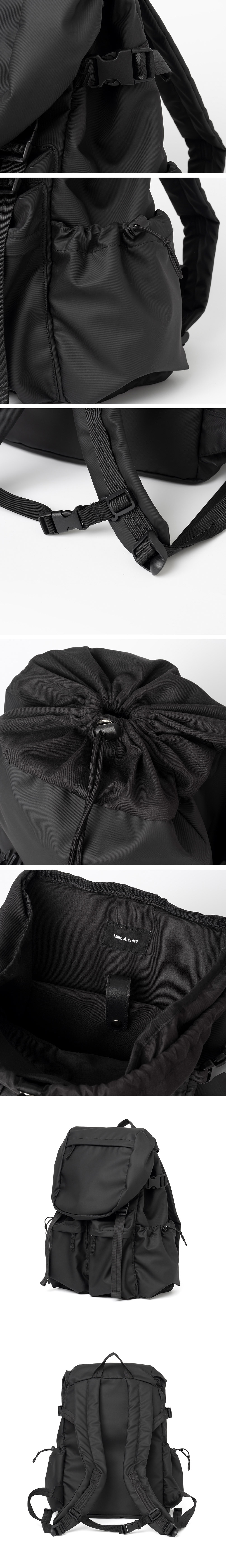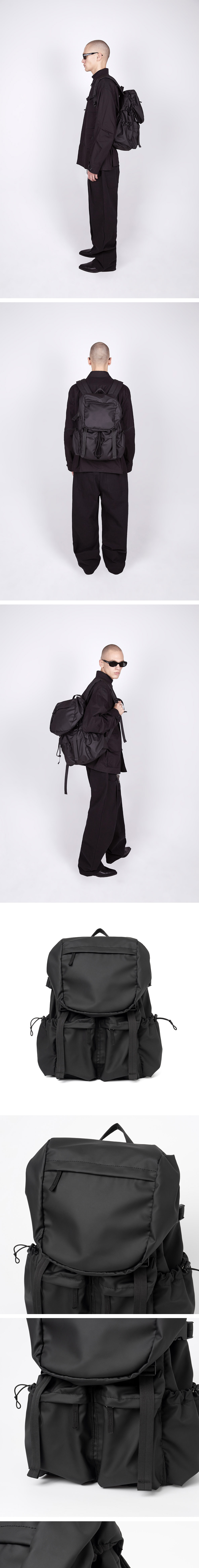 - 측면부 물통 케이스 - 총 다섯개의 외부 수납공간 - 전면부 포켓엔 지퍼가 있어 수납이 안정 - 노트북 수납칸 마련 - 가슴 스트랩으로 안정감 - 다소 아방가르드 한 실루엣 코이샴: 183cm FREE SIze 착용 투코브: 187cm FREE SIze 착용