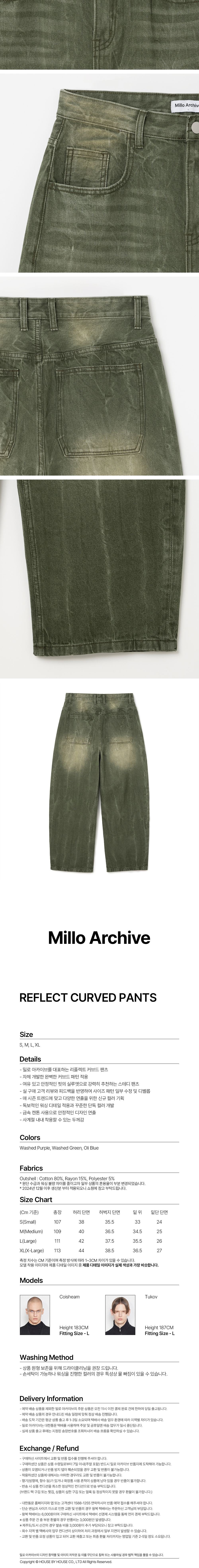 - 밀로 아카이브를 대표하는 리플렉트 커브드 팬츠 - 여유 있고 안정적인 핏의 실루엣으로 강력히 추천하는 스테디 팬츠 - 실 구매 고객 리뷰와 피드백을 반영하여 사이즈 패턴 일부 수정 및 디벨롭 - 매 시즌 트렌드에 맞고 다양한 연출을 위한 신규 컬러 기획 - 독보적인 워싱 디테일 적용과 꾸준한 단독 컬러 개발 - 금속 캔톤 사용으로 안정적인 디자인 연출 - 사계절 내내 착용할 수 있는 두께감 코이샴: 183cm L SIze 착용 투코브: 187cm L SIze 착용