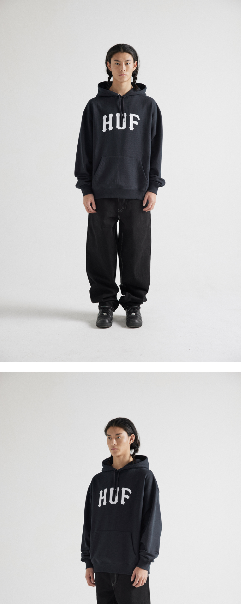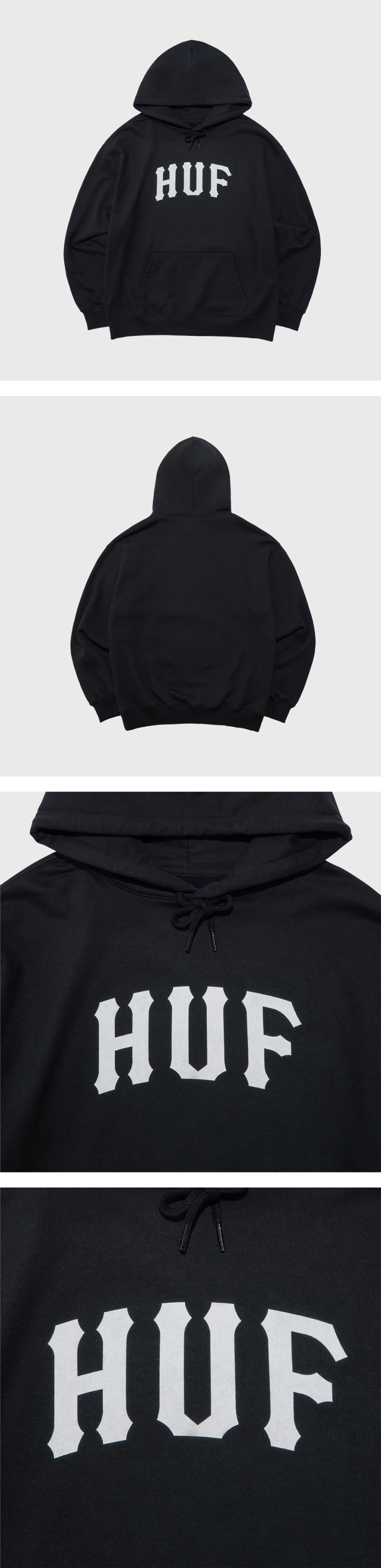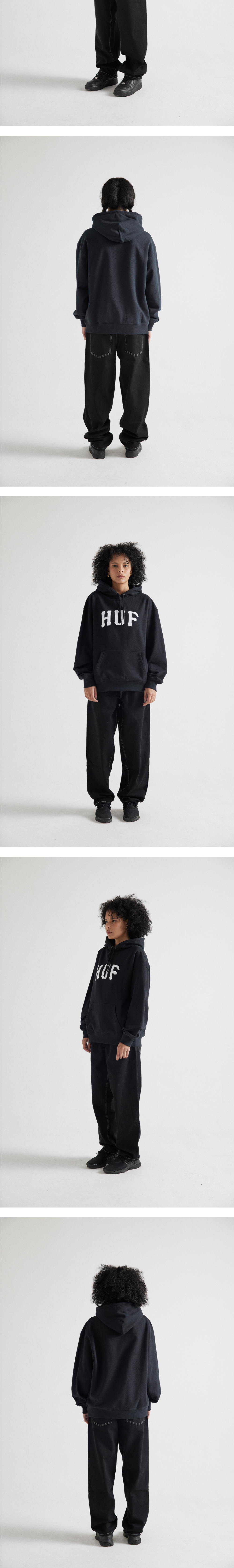 - 코튼 소재의 후디 - 전면 아치 형태의 나염 아트워크 - 목 내부의 허프 우븐 라벨