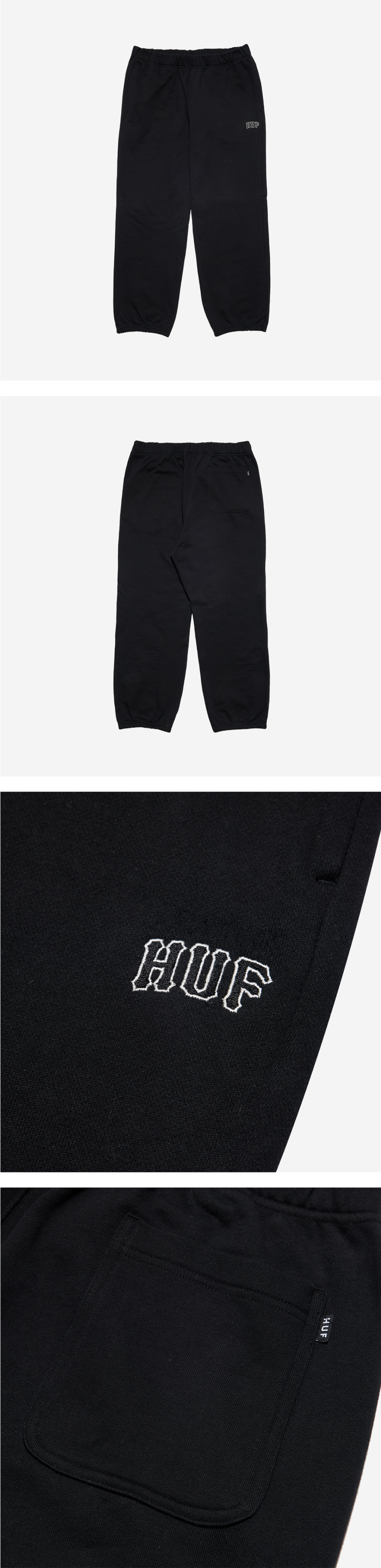 - 코튼 소재의 스웻팬츠 - 전면 좌측 아치 형태의 미니 자수 아트워크 - 허리 내부의 허프 우븐 라벨 - 후면 포켓의 허프 미니 라벨
