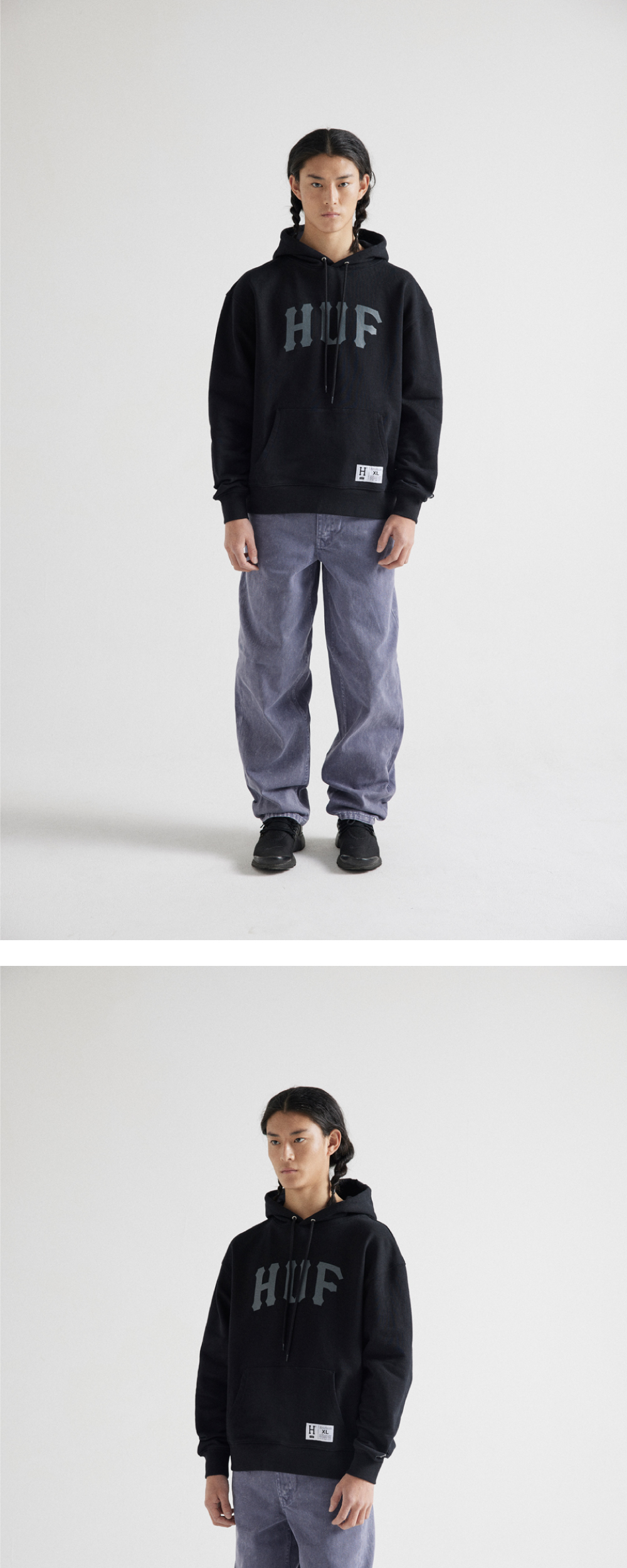 - 코튼 소재의 후디 - 전면 아치 형태의 나염 아트워크 - 포켓 좌측의 디테일 라벨 - 좌측 소매등 미니 ‘H’ 자수 로고 - 목 내부의 허프 우븐 라벨 - 좌측 하단의 허프 미니 라벨