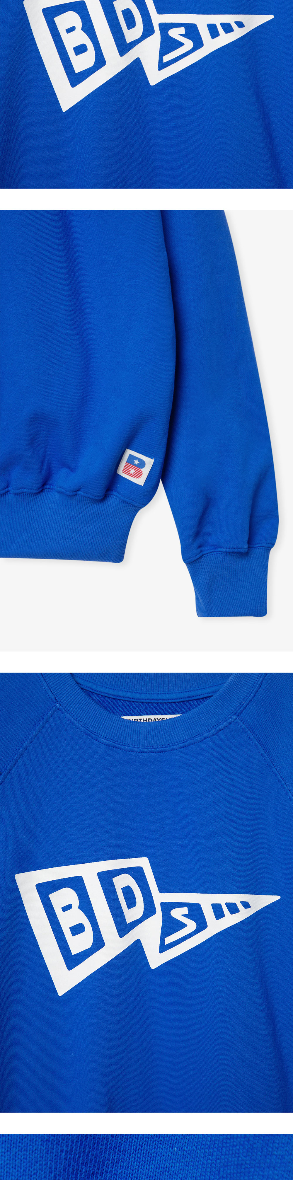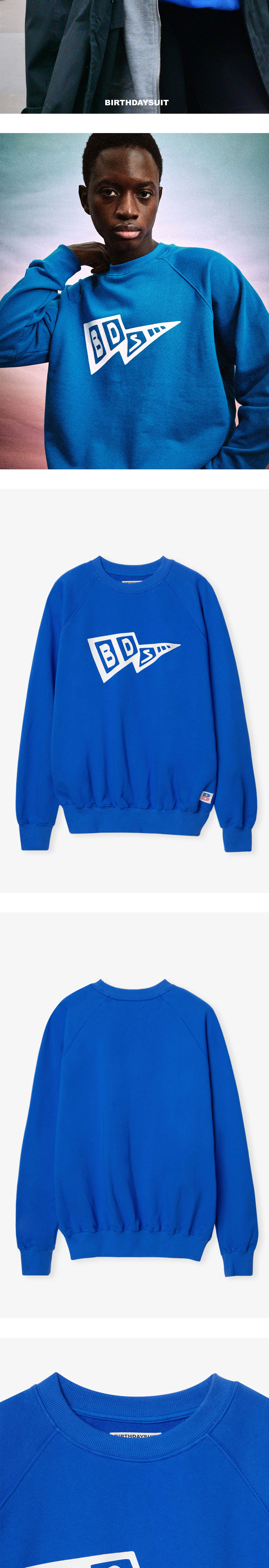 FLAG SWEAT는 코튼 폴리에스터 혼방 소재로 제작되어 부드러운 텍스처를 바탕으로 탄탄한 내구성을 느낄 수 있는 스웻셔츠입니다. 어깨에서 소매로 이어지는 래글런 소매 패턴과 리브 조직으로 마감 처리된 스웻 셔츠 밑단은 깔끔하게 실루엣을 잡아줍니다. 전면부에는 벌스데이수트의 시그니처 그래픽 BDS 로고로 포인트를 주었으며, 하단에는 미국의 성조기에서 영감을 받은 B 로고 그래픽 자수가 삽입되어 있습니다. 전체적으로 여유로운 실루엣으로 단독 혹은 레이어드하여 착용 가능하며, 군더더기 없는 완벽한 실루엣을 선사합니다.