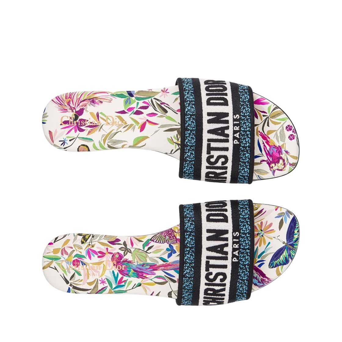 (W) Dior Dway Slide Embroidered Cotton with Toile de Jouy Fantastica Motif White Multicolor