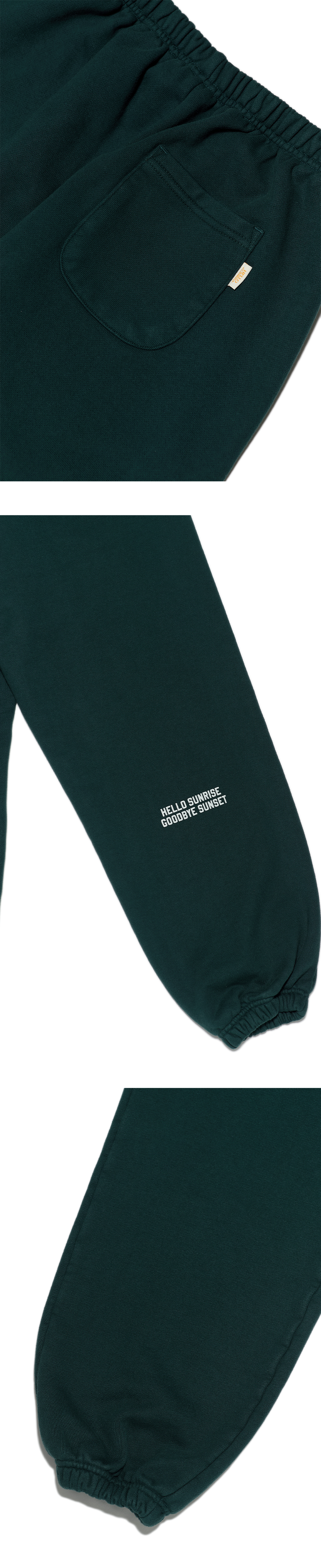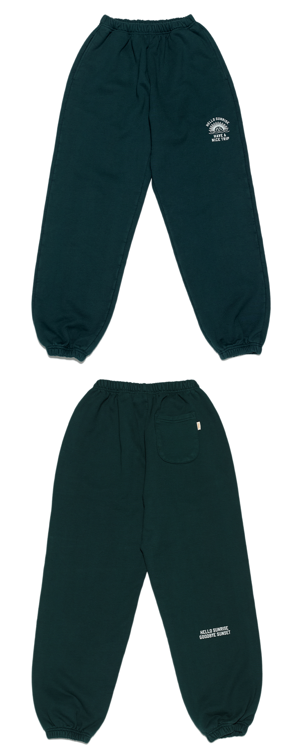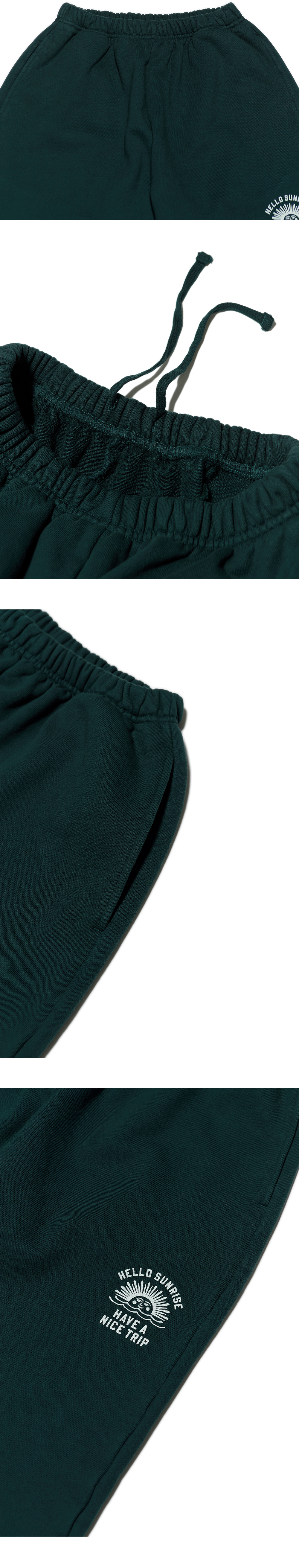 헬로선라이즈 미니 아치 로고 그래픽이 프린팅 된 스웻팬츠 입니다. - 사이드 포켓 2개 - 후면 포켓 1개 - 후면 포켓 포인트라벨 - 후면 하단 헬로선라이즈 슬로건 프린팅