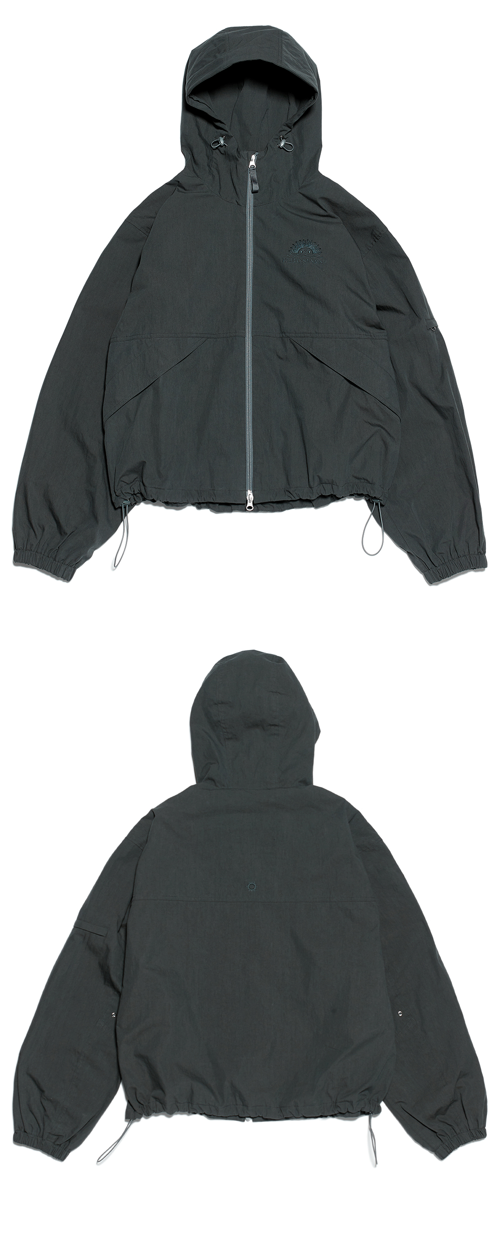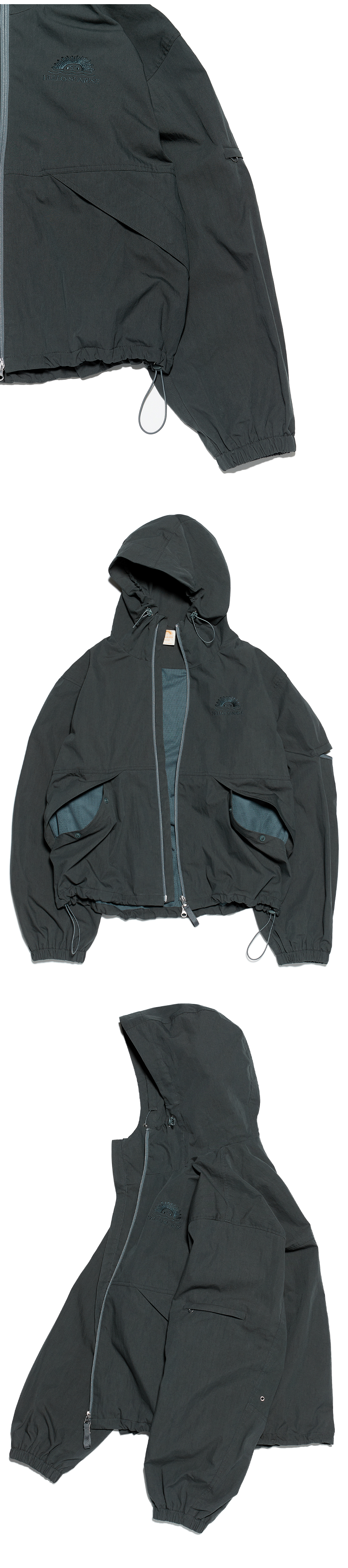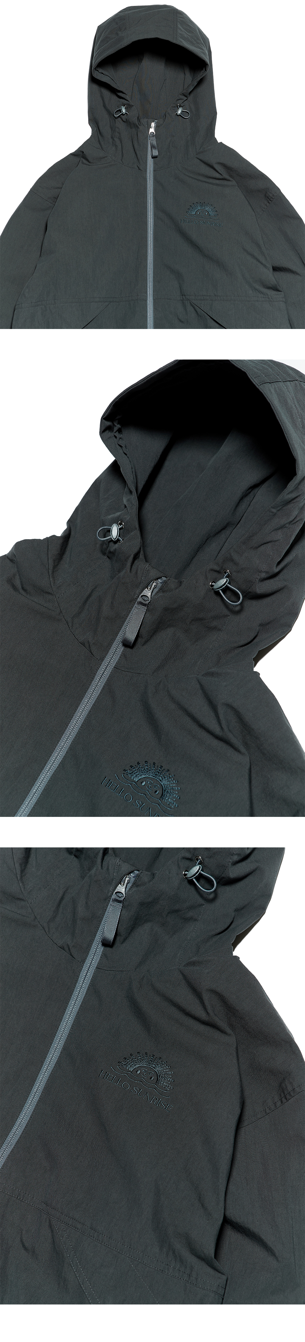 헬로우선라이즈 로고가 자수처리 된 짚업 후디자켓입니다. - Cotton / Nylon 소재의 짚업 후디 자켓 - 전면 포켓 2개 / 소매 포켓 1개 - YKK 2Way Zipper 와 Sun Grip 스냅버튼 - 밑단 스트링 조절 / 소맷단 밴딩 - 가슴 / 등판 톤앤톤 로고 자수처리 - 편안한 착용감의 루즈한핏 실루엣