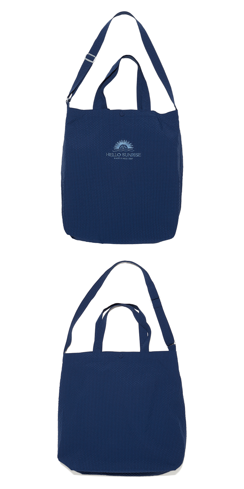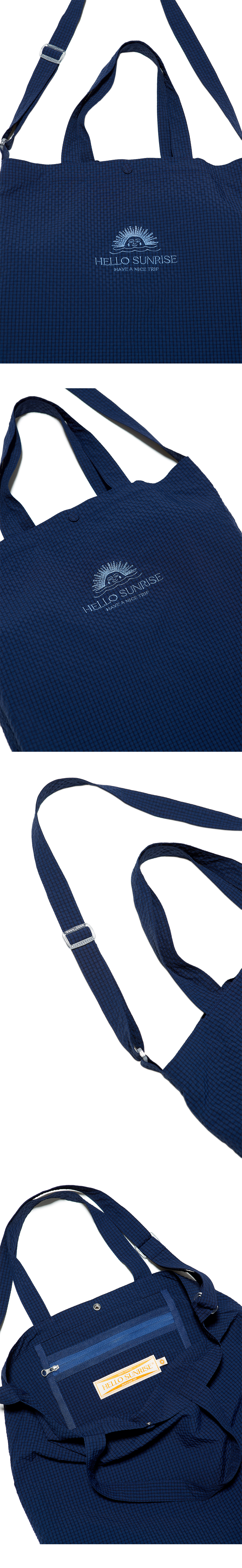 Hello Sunrise 로고가 자수 된 투웨이 백입니다. - 투톤 Gingham 체크 소재의 고급 일본 원단 사용 - 내부 지퍼 마감처리된 미니 포켓 - 어깨 스트랩 조절 가능 - 핸들 손잡이가 있어 다양한 연출 가능