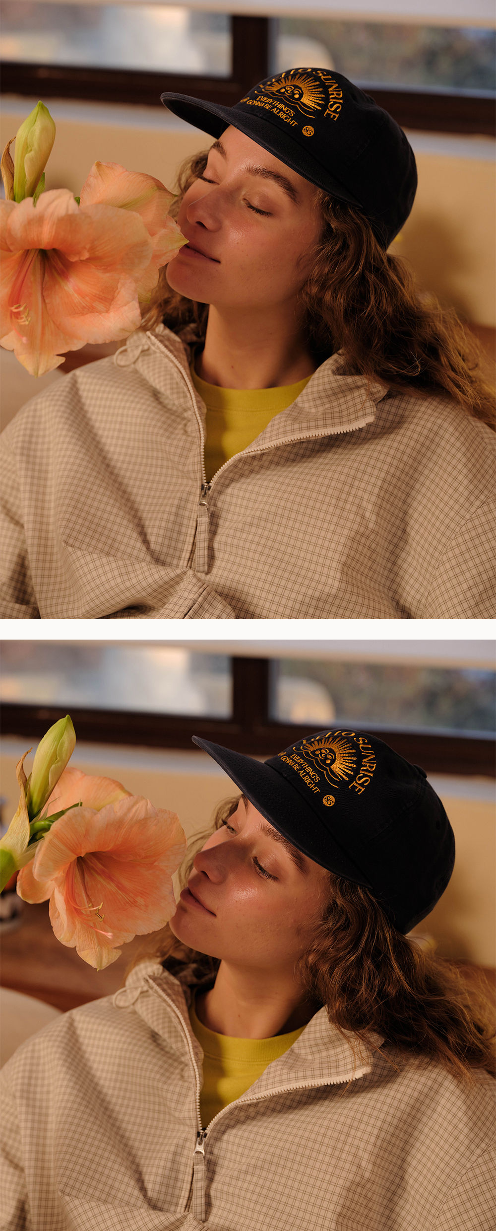 헬로선라이즈 아치 로고 그래픽이 자수로 들어간 6패널 캡입니다. 워싱 가공으로 빈티지한 무드를 더하였으며 뒤판 작은 심볼을 자수 처리하여 포인트를 주었습니다.