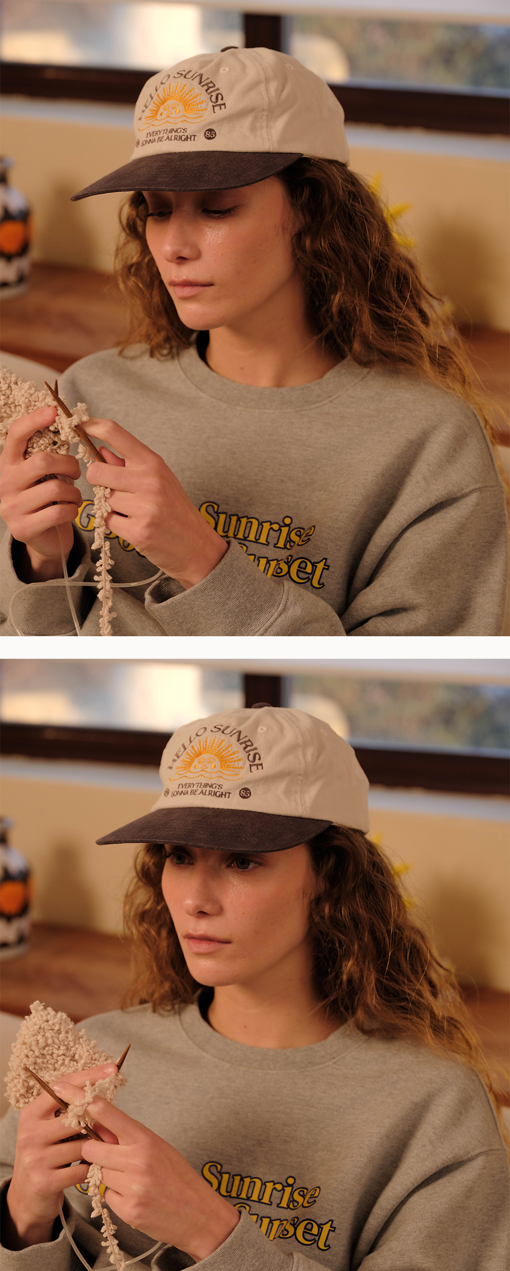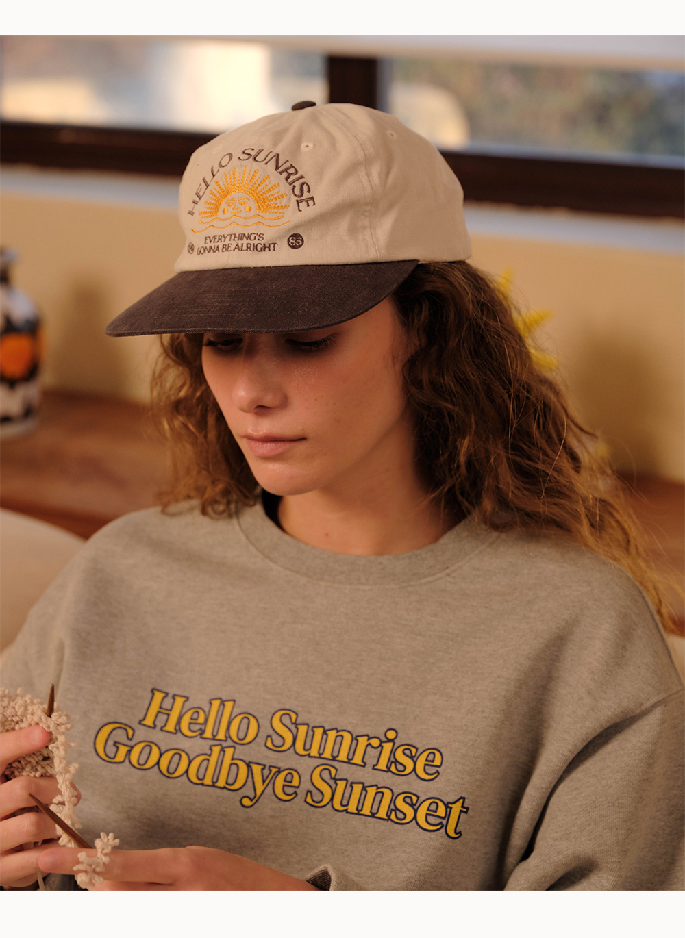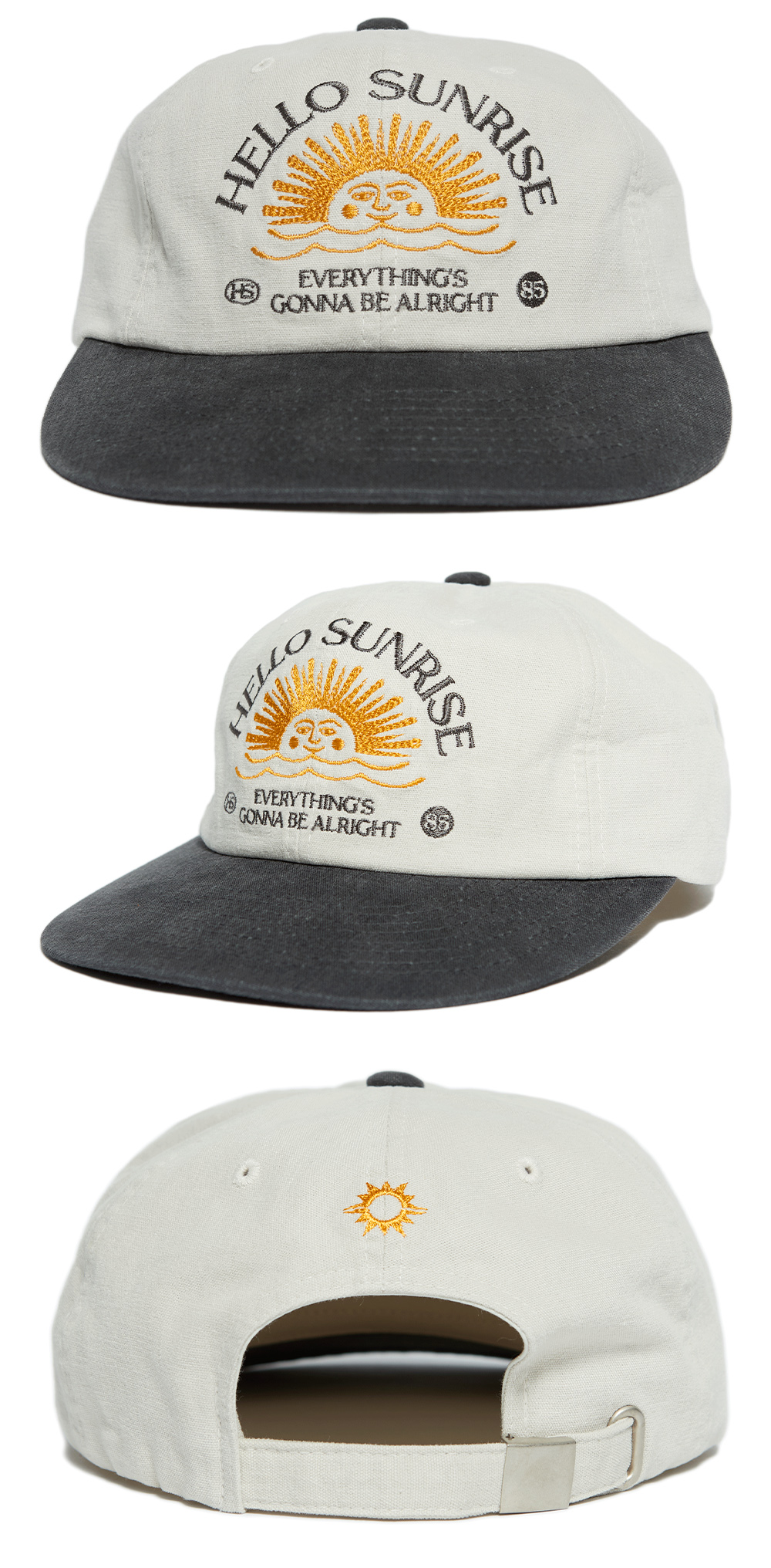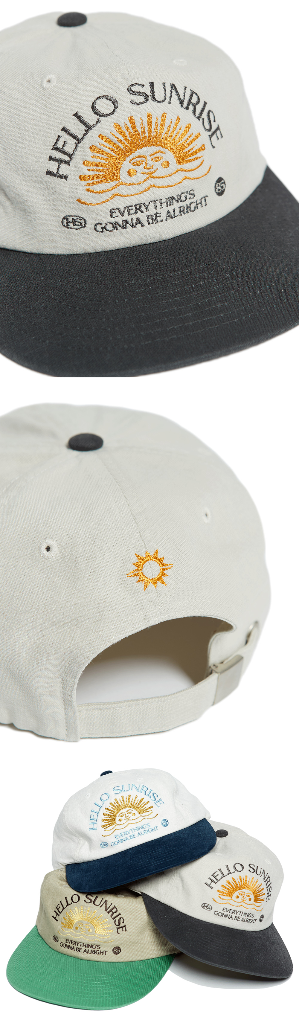 헬로선라이즈 아치 로고 그래픽이 자수 처리 된 투톤 6패널 캡입니다. - 워싱 가공으로 빈티지한 무드 - 뒤판 Hello Sunrise 심볼 자수 처리
