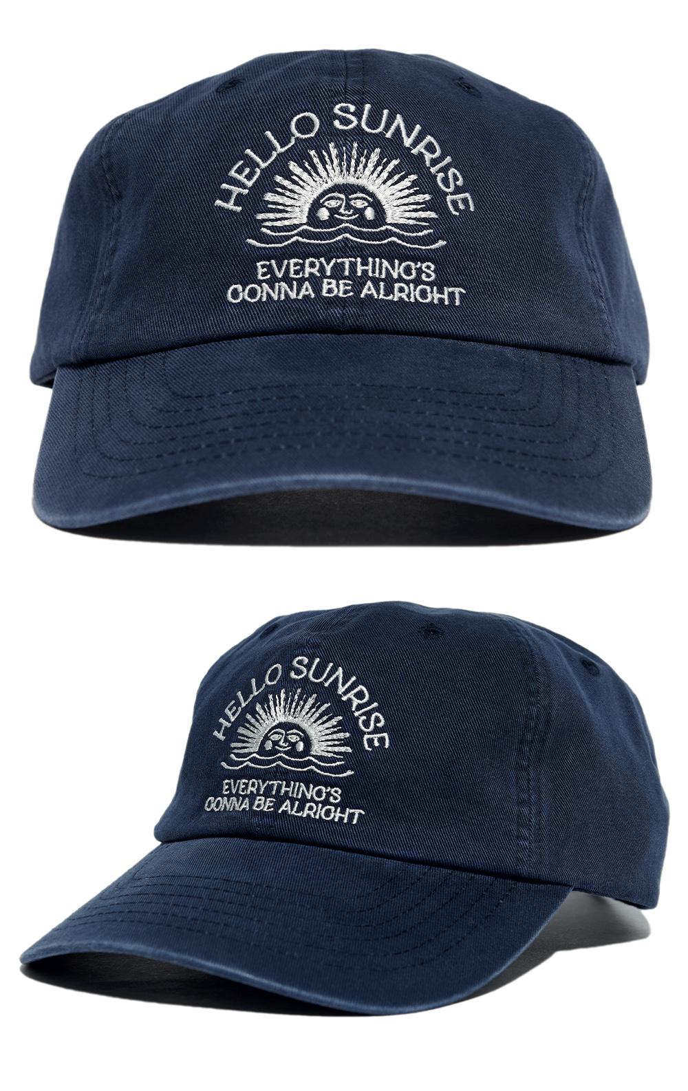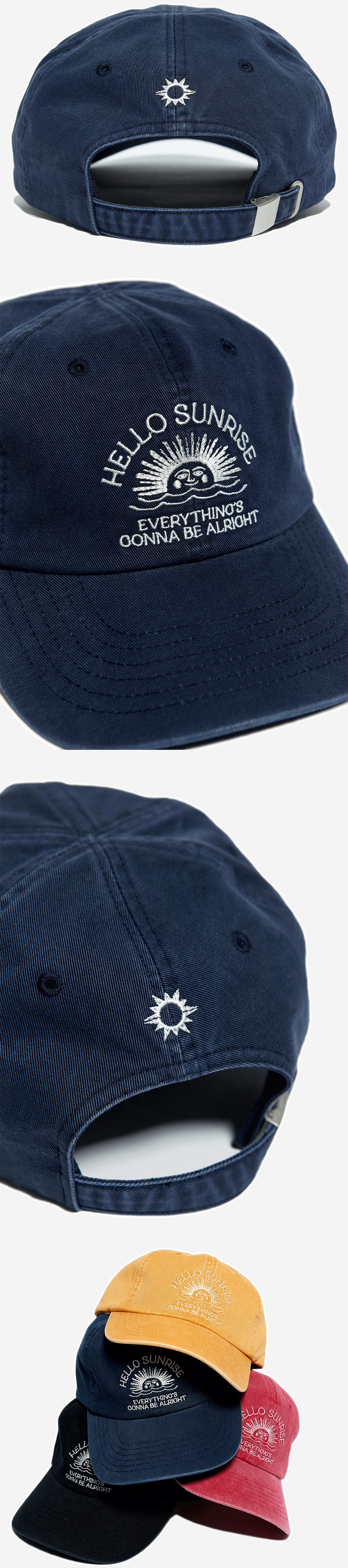 헬로선라이즈 아치 로고 그래픽이 자수로 들어간 커브드 볼캡입니다. - 워싱 가공으로 빈티지한 무드 - 뒤판 Hello Sunrise 심볼 자수 처리