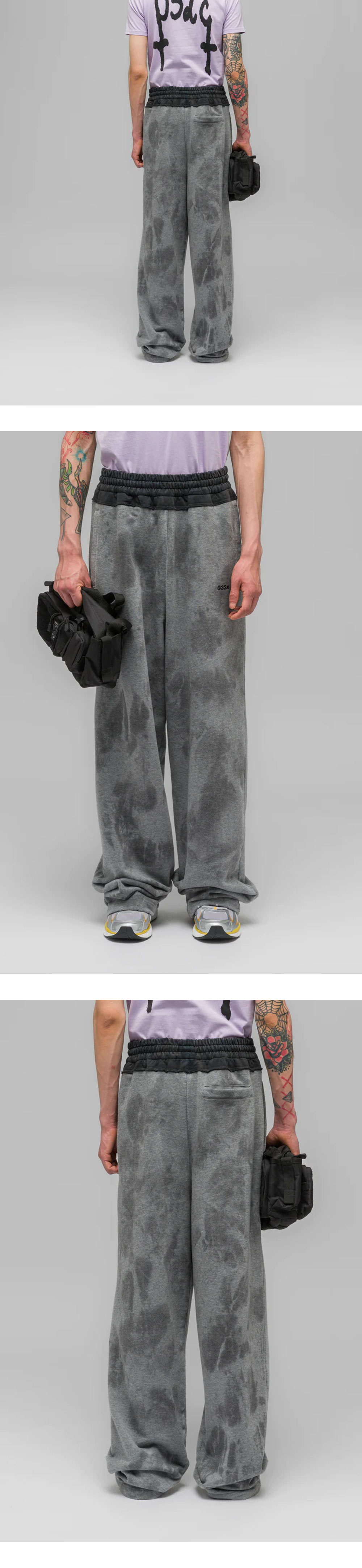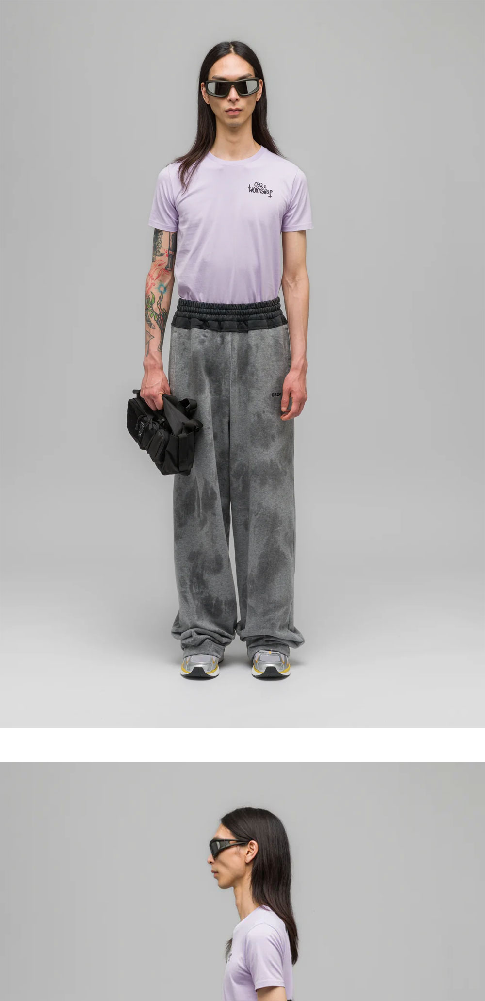 허리 밴드에 마감 처리되지 않은 가장자리가 특징인 배기 와이드 핏의 스웨트팬츠입니다. - 시각적인 대비를 강조하기 위해 두 가지 컬러의 사용 - 특수 오일 다이 얼룩 효과와 바랜 듯한 컬러감 - 032c 로고 자수 - 오버사이즈 핏