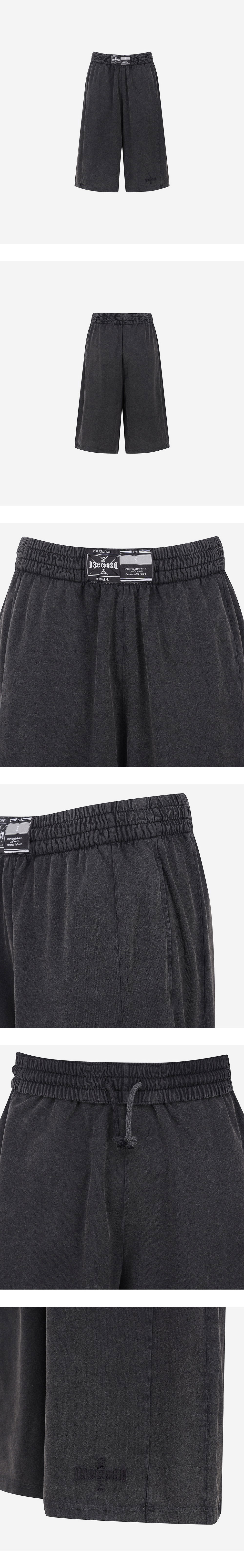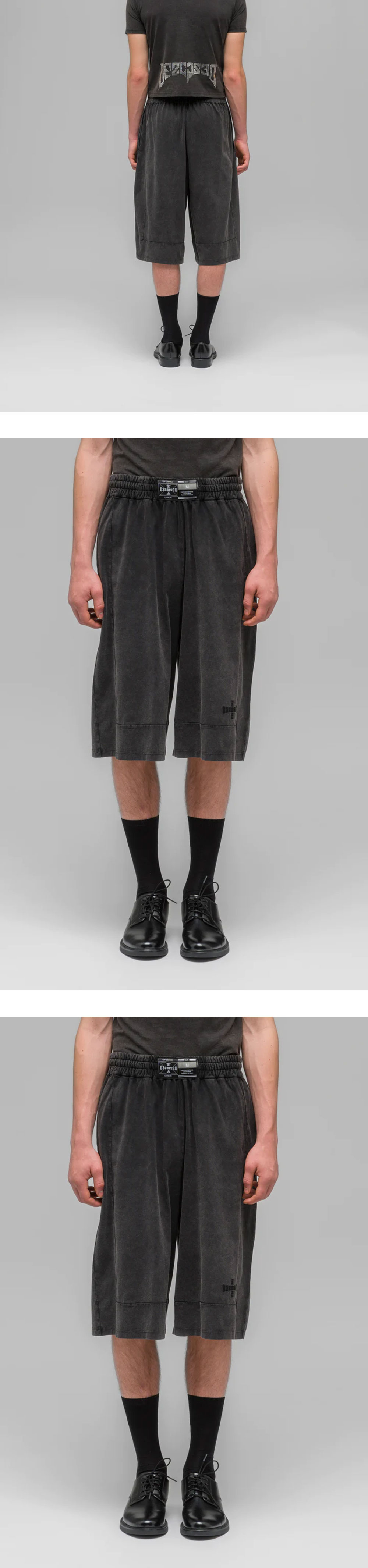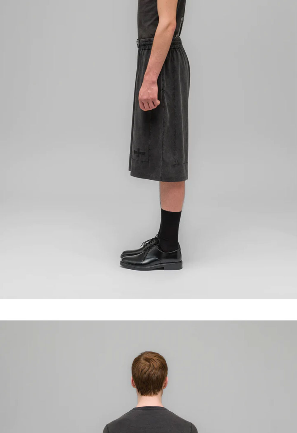 농구에서 영감을 받은 핏과 레이어드 구조의 페이디드 블랙 쇼츠입니다. - 24SS 시즈널 자수와 블랙 컬러의 팀 퍼포먼스 라벨 - 24SS 시즌 런웨이 컬렉션 룩 - 오버사이즈 핏