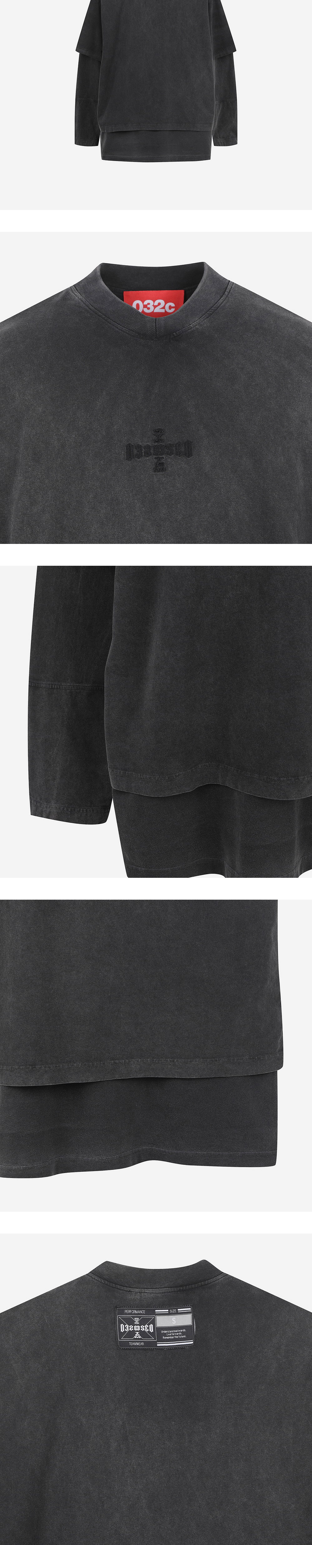 더블 레이어 구조와 V넥 칼라가 돋보이는 032c의 롱슬리브 티셔츠입니다. - 24SS 시즌 런웨이 컬렉션 룩 - 24SS 시즈널 자수와 팀 퍼포먼스 라벨 - 오버사이즈 핏 - 가먼트 다이 및 페이드 아웃 처리