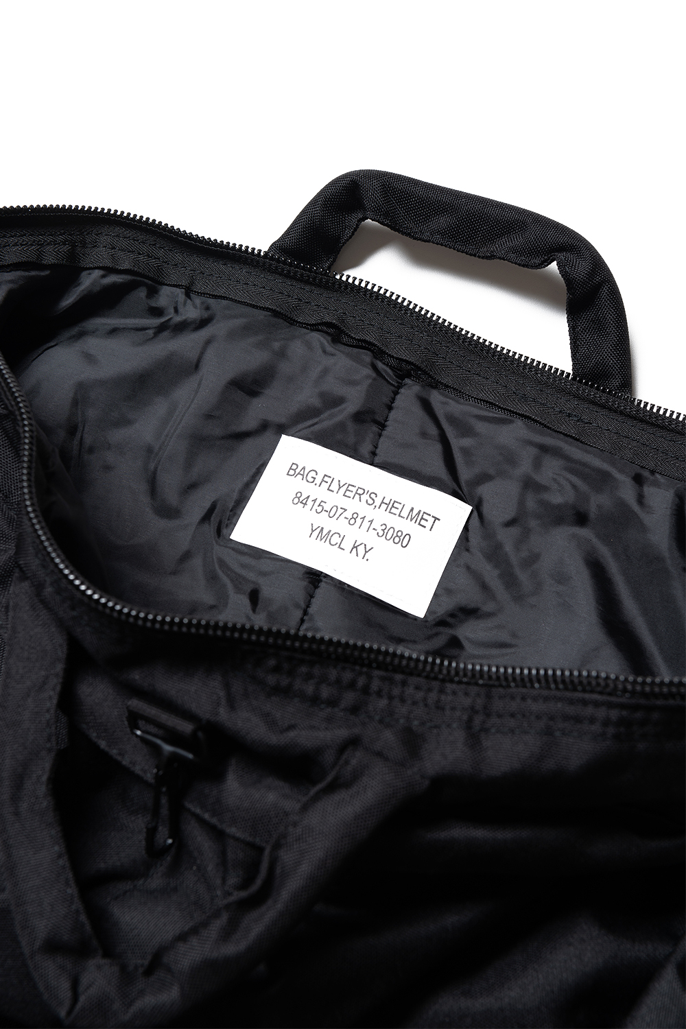 YMCL KY Helmet Bag - Black 미공군 핼맷백입니다. 프론트의 2개의 버튼 타입 포켓과 내부 양측의 2개의 포켓이 있어 수납에 용이합니다.