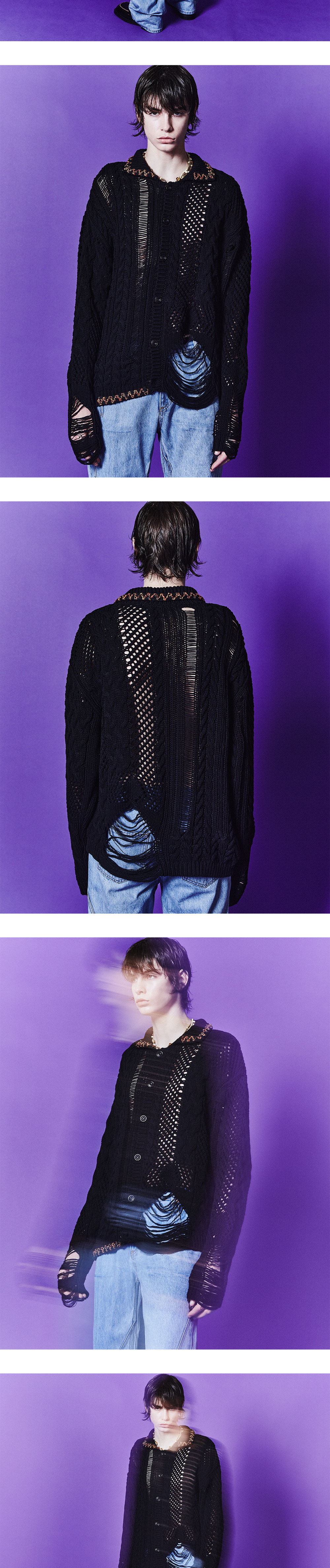 - SAUVAGE 코튼 원사 - 오버사이즈 실루엣 - 코튼 원사 케이블 조직 믹스 - Damaged, 트리밍 장식 디테일 - 로고 단추 여밈 - Rib With Collar, Cuffs and Hem