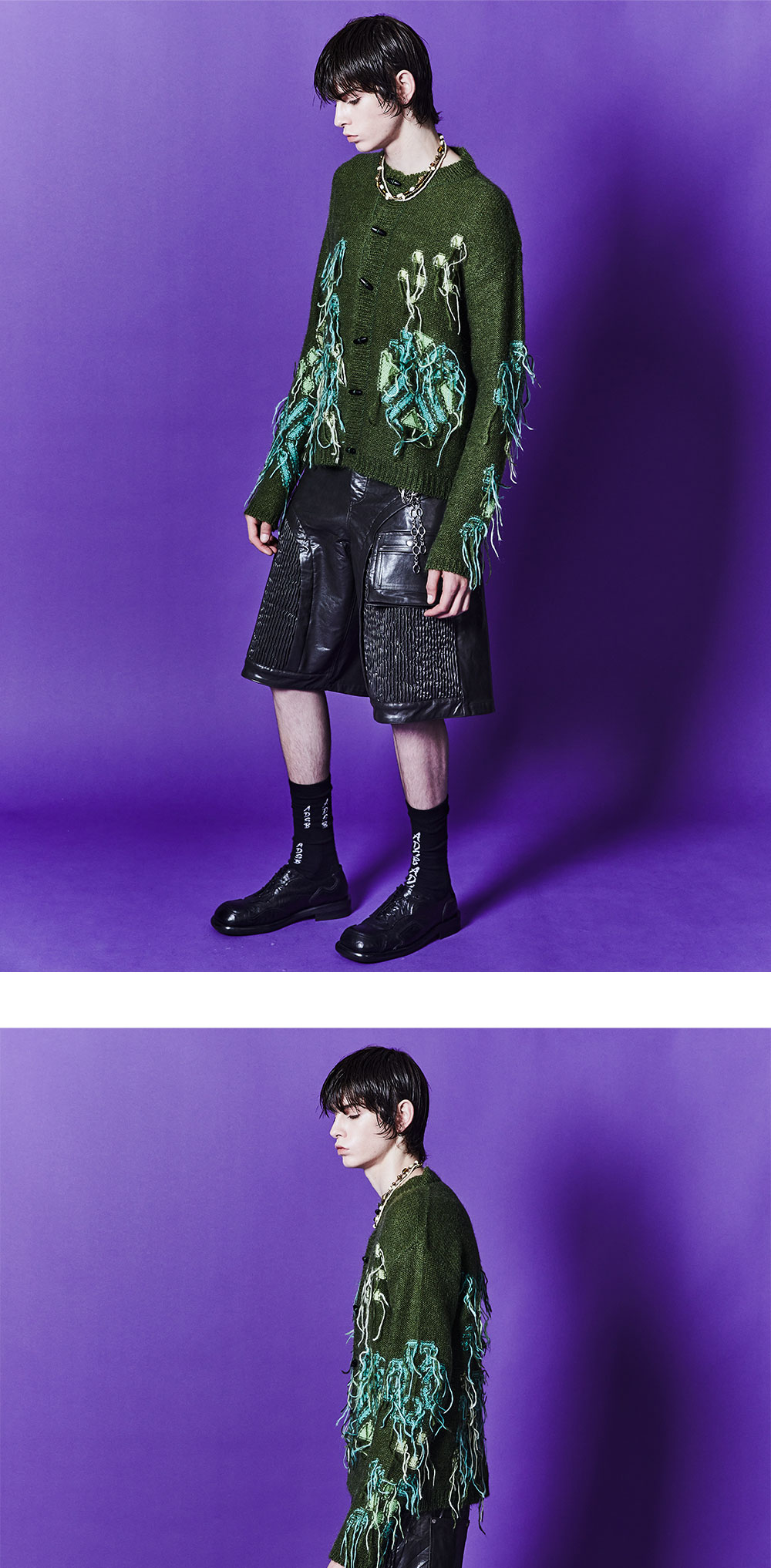 - 스탠다드 실루엣 - 키드모헤어 혼방 원사 - 인타샤 프린지 니팅 - 토글 단추 여밈 디테일 - Rib With Collar, Cuffs and Hem