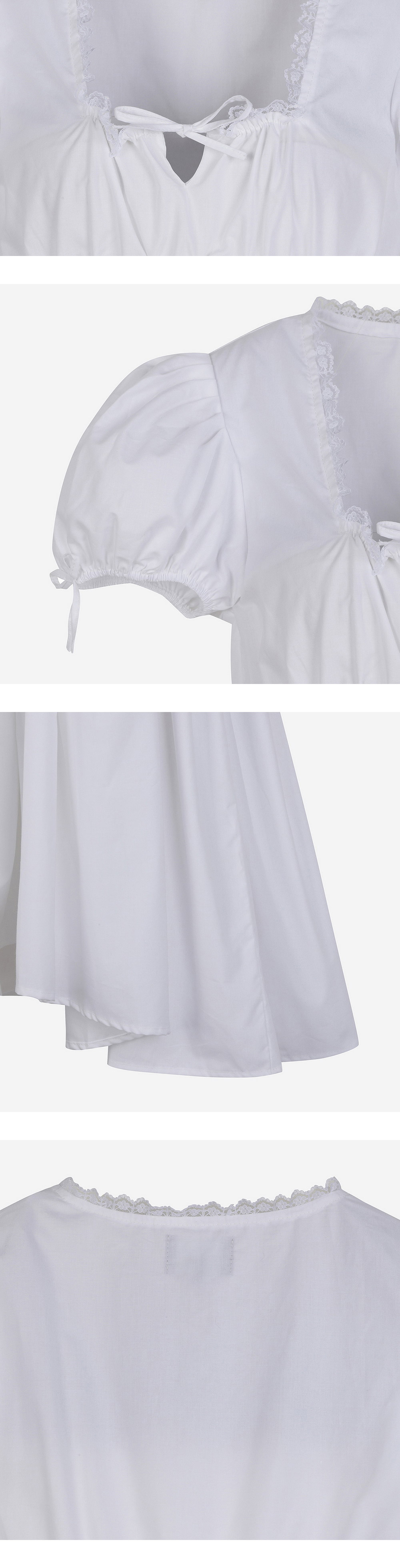 - 비대칭 베이비돌 드레스 - 스퀘어 네크라인과 레이스 장식 - 짧은 퍼프 소매와 리본 디테일