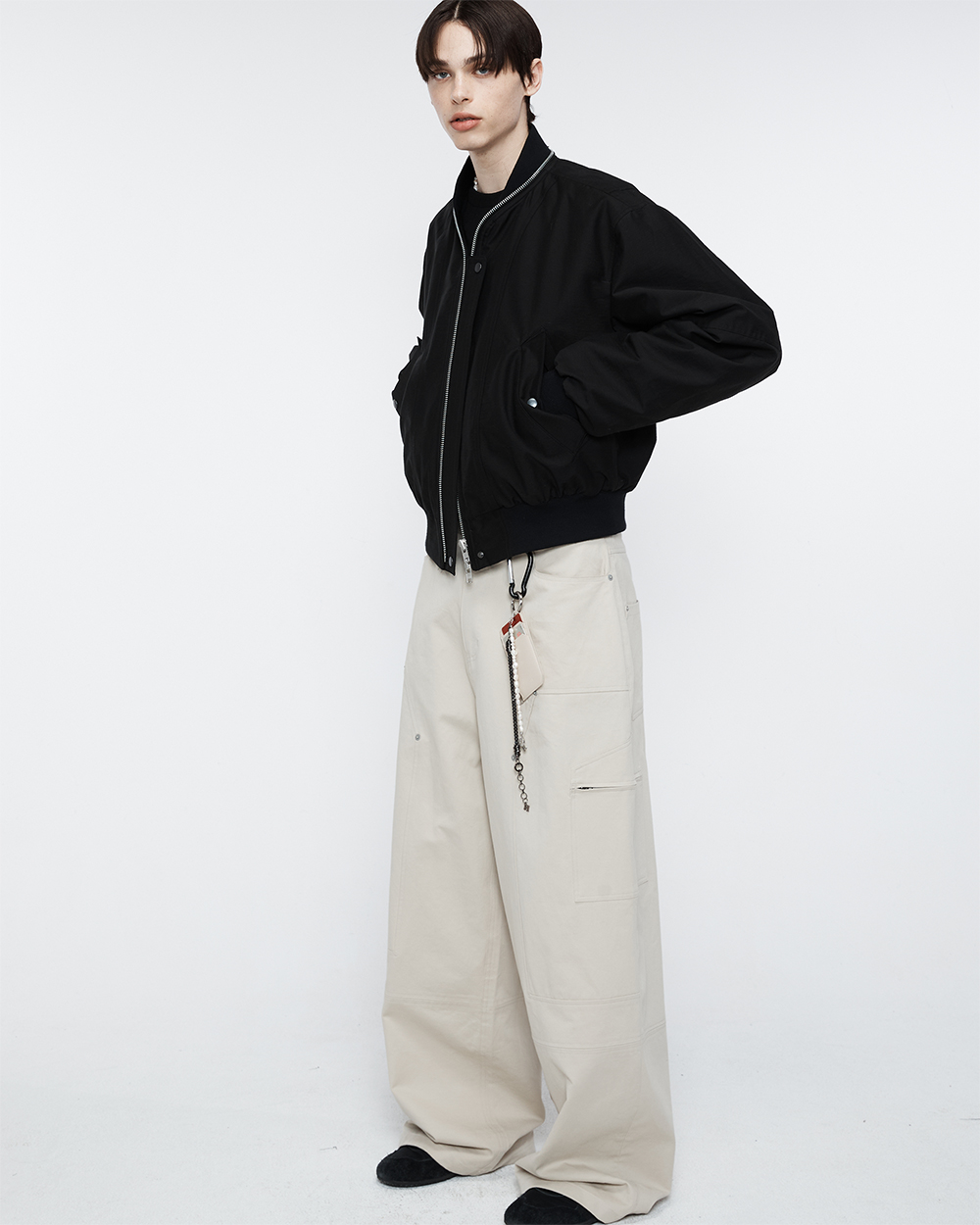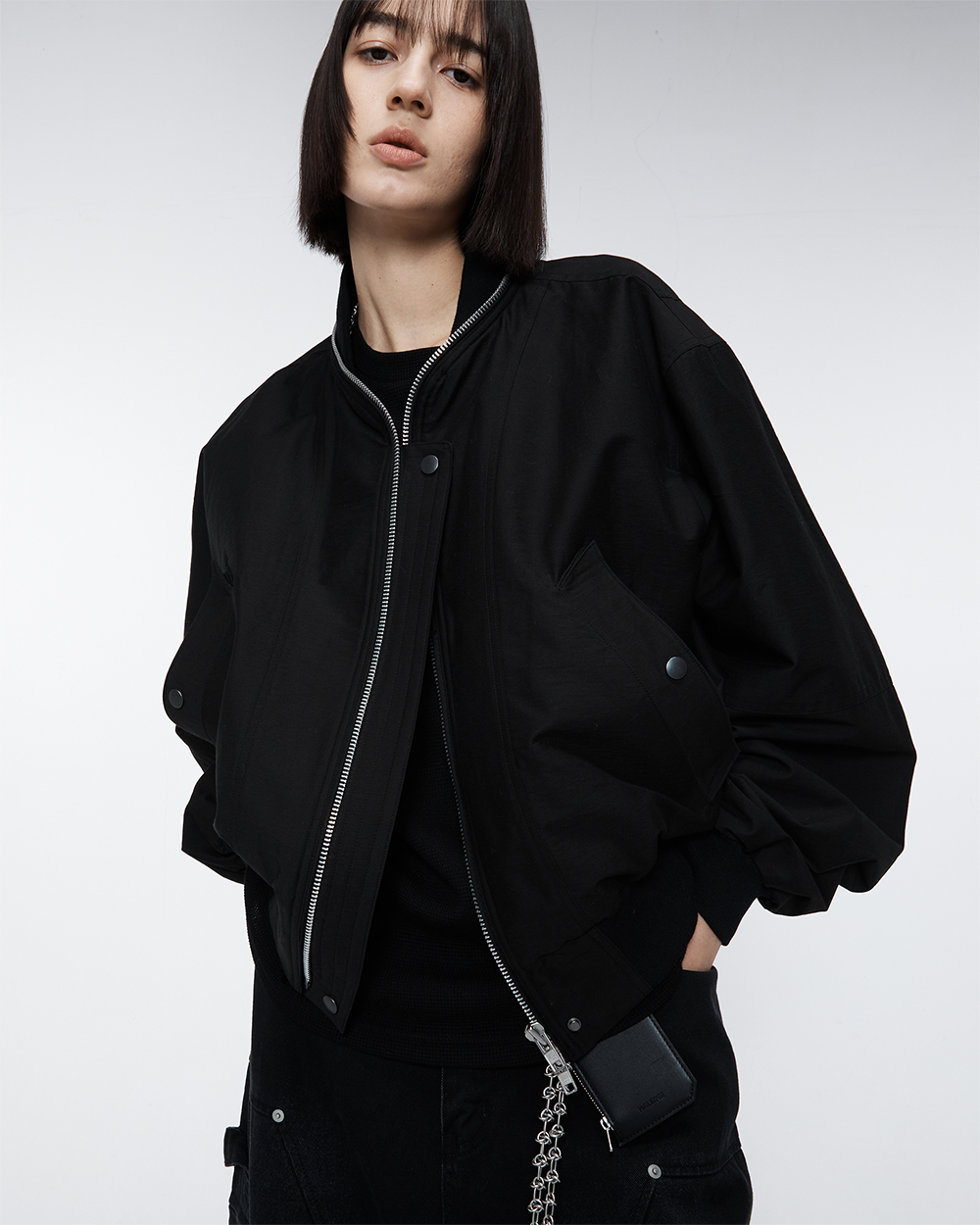 지퍼를 활용하여 다양한 네크라인 연출이 가능한 블루종입니다. 은은한 광택감이 도는 유니크한 텍스쳐로 제작되어 고급스러운 느낌을 줍니다. 세미 오버핏 실루엣에 균형감이 좋아 데일리로 편하게 입기 좋습니다. -DETAIL- 네크라인 전체 지퍼 처리 입체 절개 등판 사이드 절개 디테일 2WAY 스냅 플라켓 디테일 입체 폴딩 포켓 디테일 몸판 절개와 맞물리는 시보리 디테일