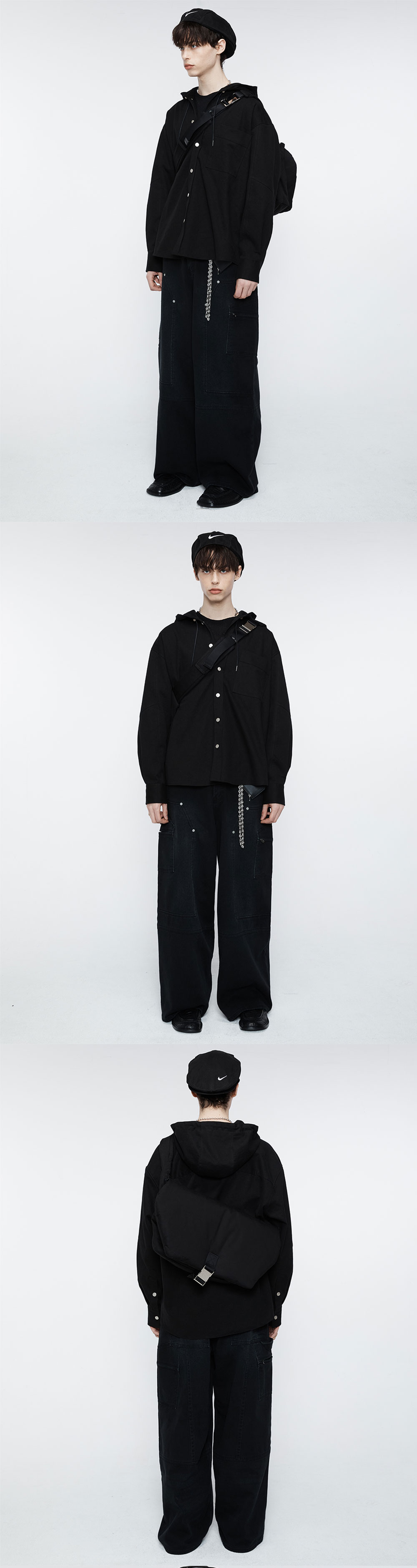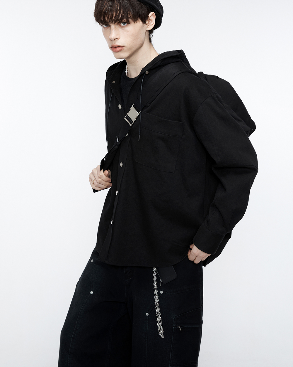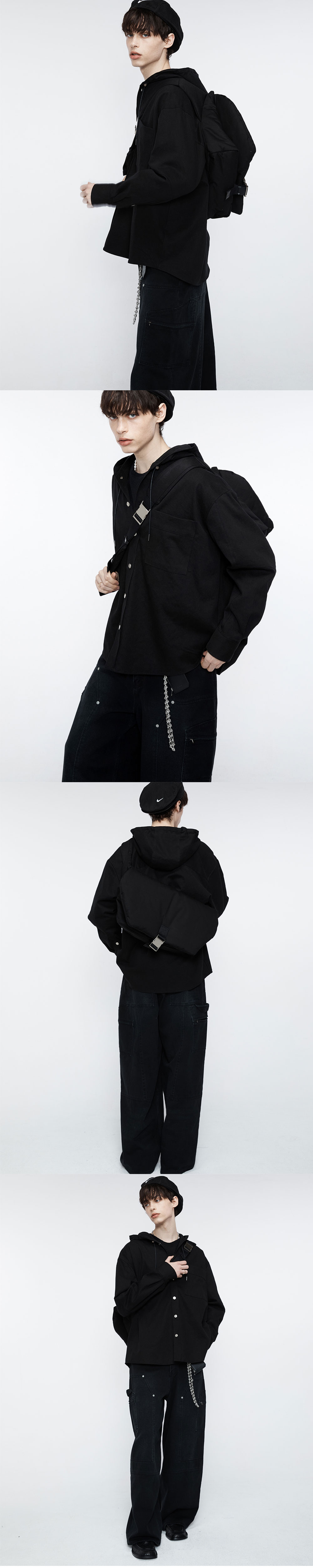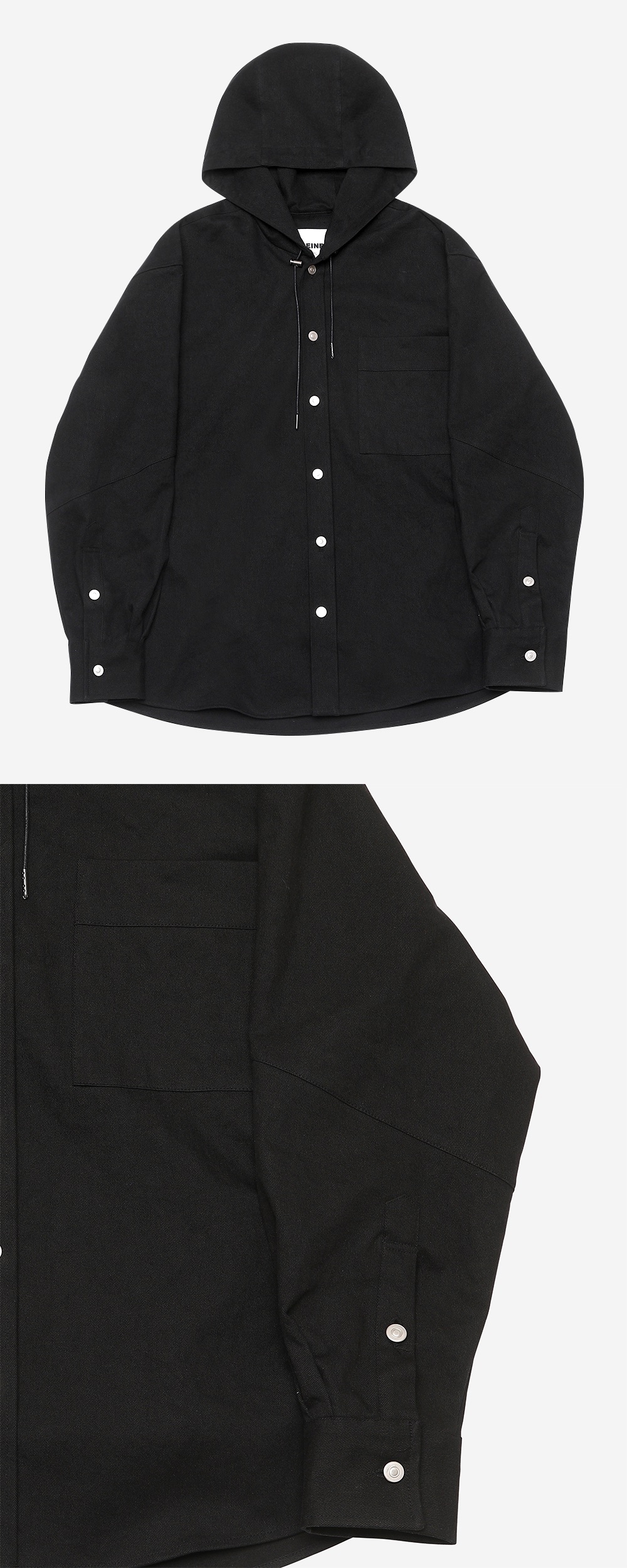 워시드 가공하여 부드러운 데님 소재의 오버사이즈 실루엣 후드 셔츠입니다. 박시한 실루엣으로 편하게 입기 좋은 제품입니다. -DETAIL- 소매 밑단 절개 / 등판 절개 처리 사이드라인 절개 팁 작업 처리된 코팅끈과 금속 스토퍼로 포인트