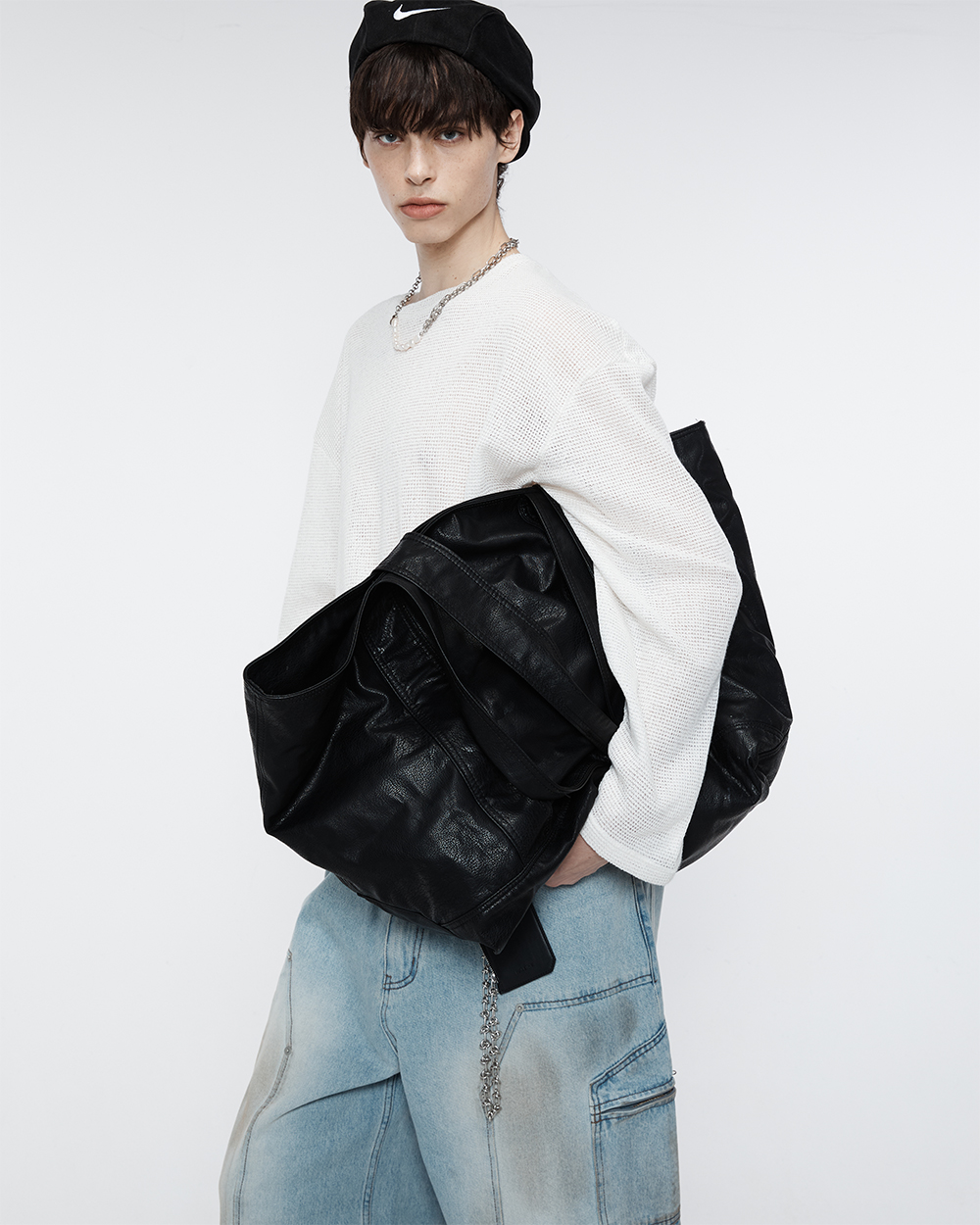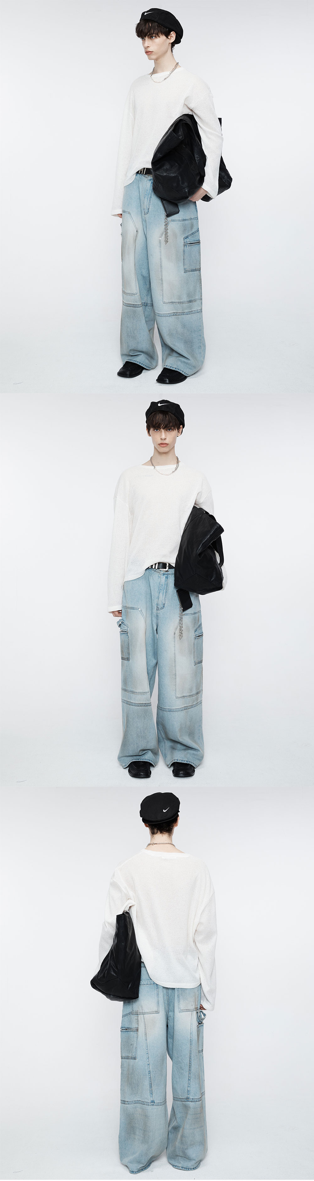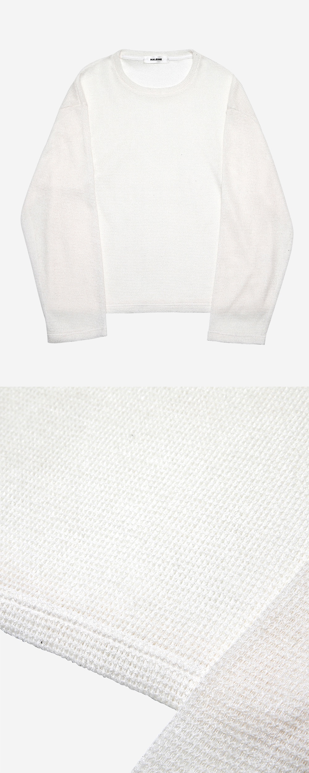 메쉬 니트 소재의 롱 슬리브입니다. 패브릭이 부드러워 맨살 착용 가능하며, 비침이 심하지 않아 이너로는 단품 착용 가능합니다. 박시한 실루엣으로 데일리로 편하게 입기 좋습니다.