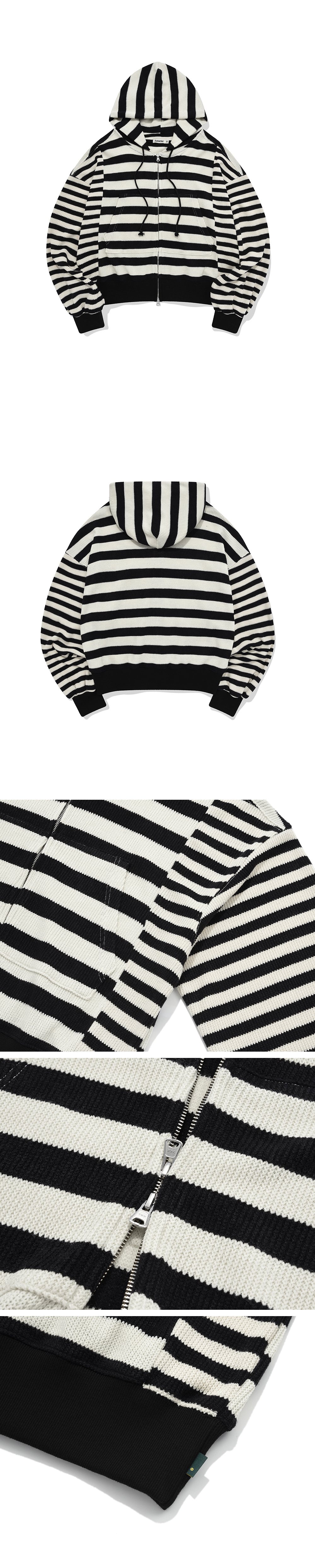 카락터 스트라이프드 니트 후드 집업 아이보리 블랙