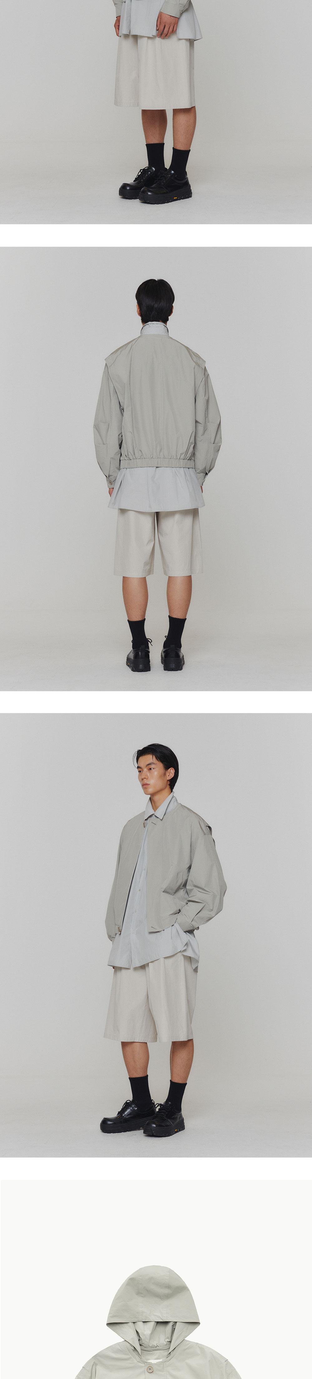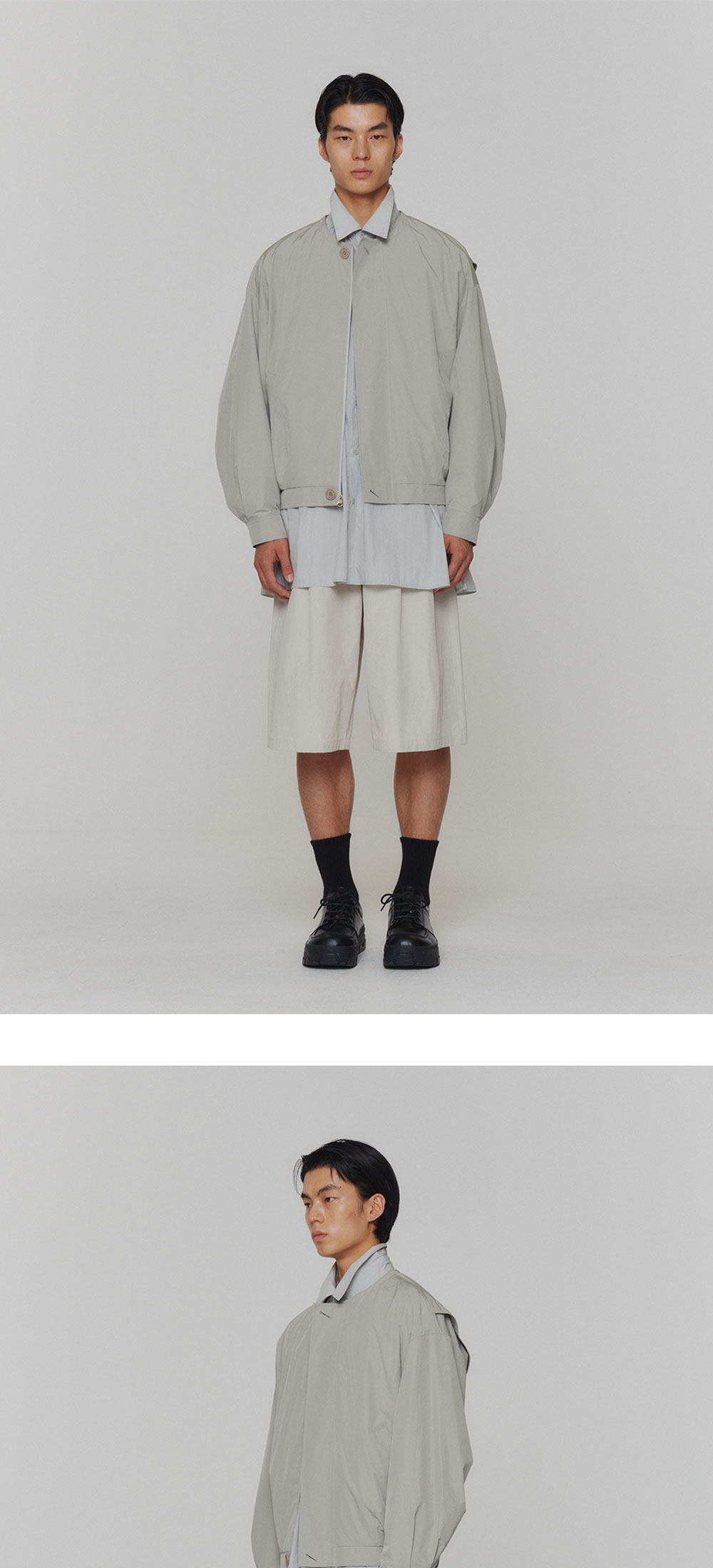 코튼 나일론 소재의 볼륨감이 돋보이는 점퍼 볼륨 있는 실루엣과 탈부착 후드로 활용성을 높인 점퍼입니다. 소매와 뒤판의 턱으로 볼륨 있는 실루엣을 강조하였습니다. 밑단 밴딩 처리로 편하게 착용 가능하며, 첫 번째와 마지막을 제외한 단추를 히든으로 처리하여 깔끔한 디자인을 완성했습니다. 활용도 높은 웰트포켓과 안감이 있는 제품으로 간절기 아이템으로 활용하기 좋은 완성도 높은 아이템입니다. 코튼 나일론 소재 볼륨감 있는 실루엣 탈부착 후드 앞 지퍼 여밈 웰트 포켓 디테일 *실제 컬러와 디테일은 상세 이미지와 가장 유사합니다. 모델 착용 사이즈 M / 모델 스펙 188cm