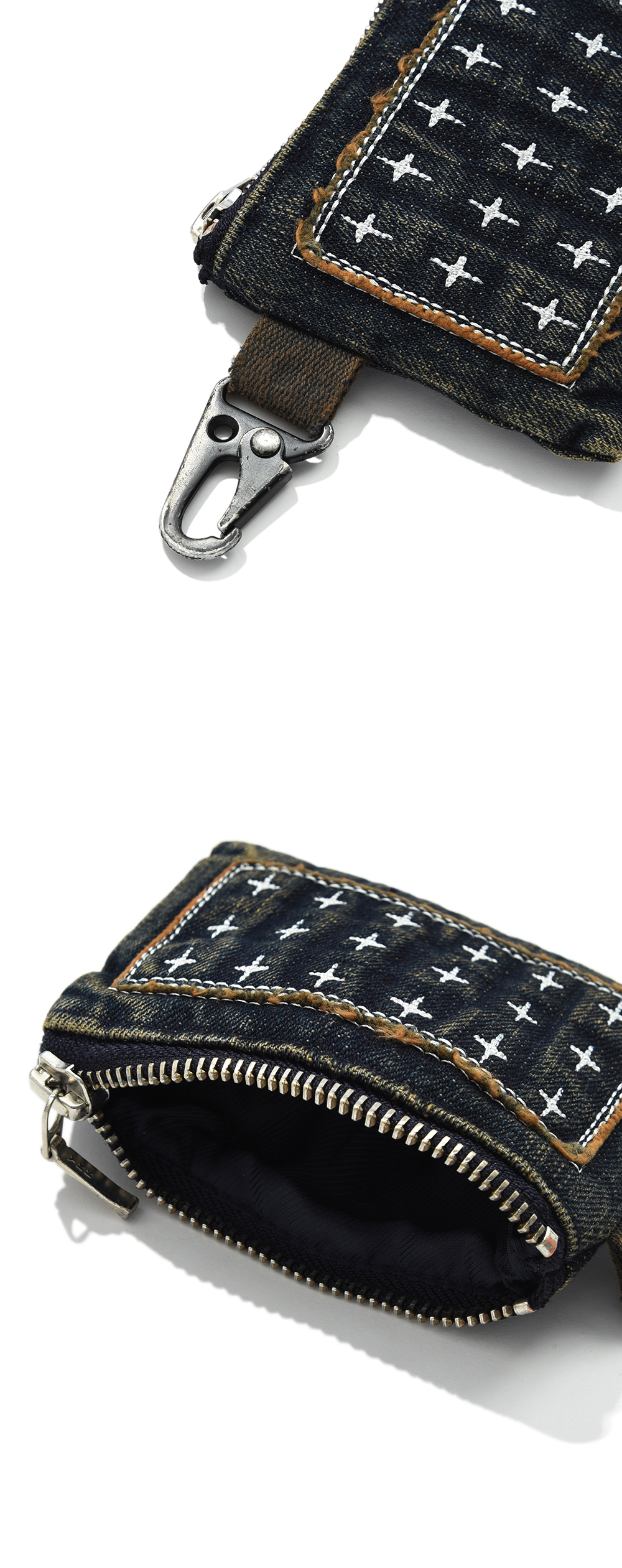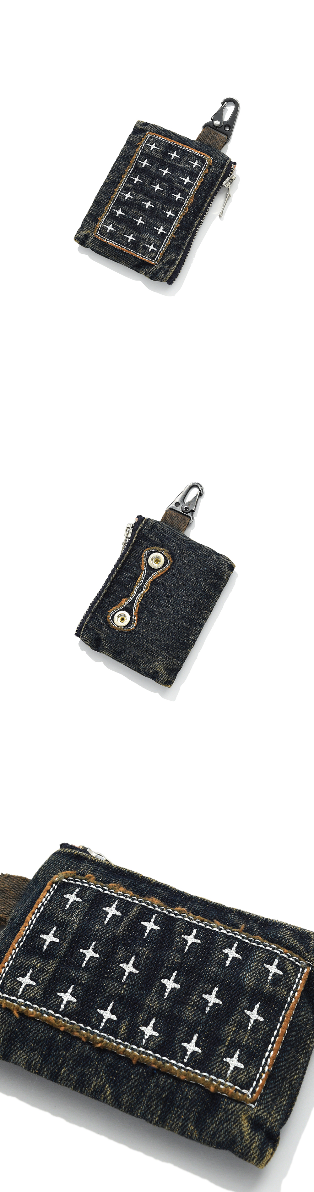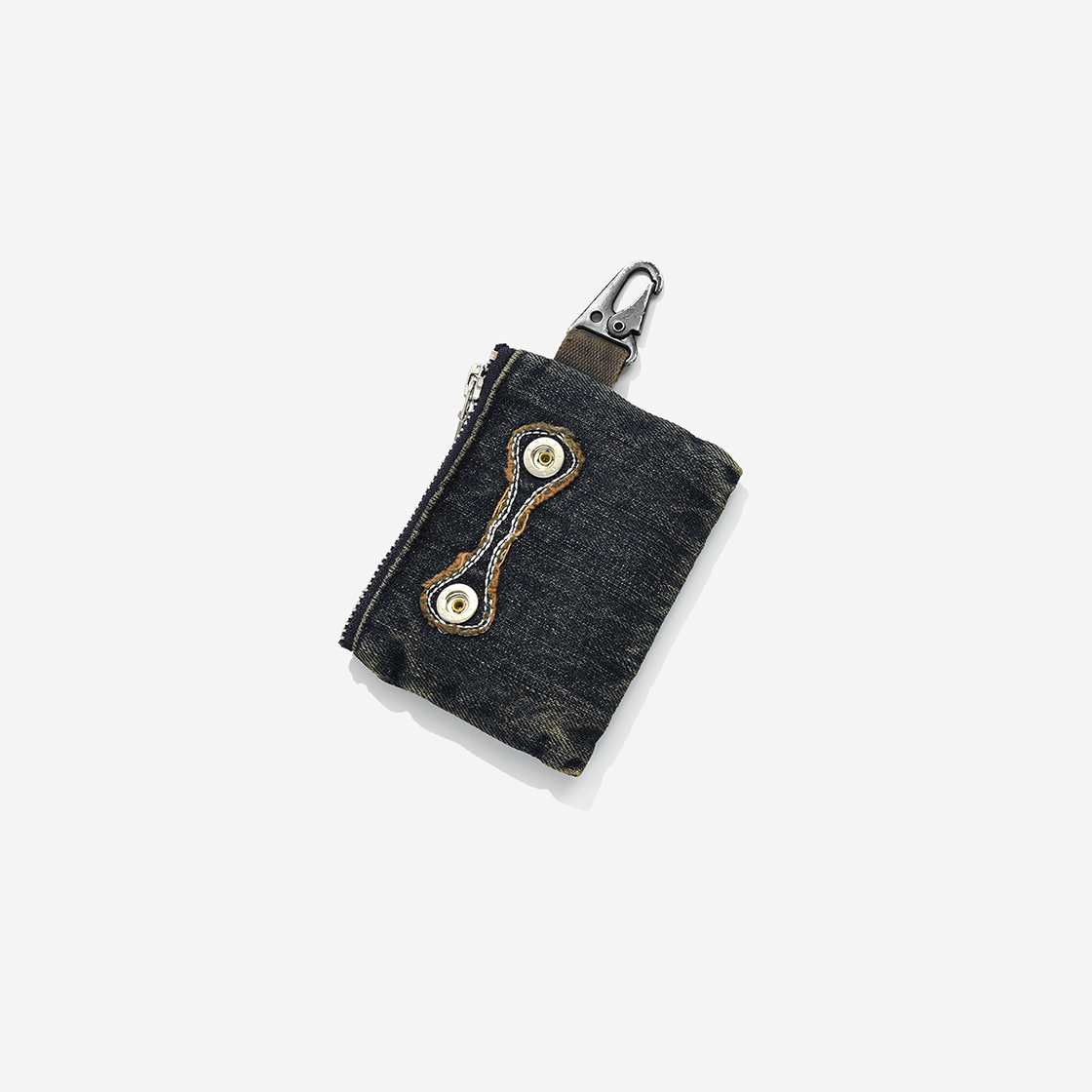 Product Info. - 겉면 러프한 슬라브 텍스처의 데님 원단 - 디스트로이드 빈티지 워싱 - 카드 및 에어팟 등 수납이 가능한 키링 형태의 파우치 - 시그니처 패치워크 자수와 YKK PERMEX 스냅 포인트 Fabric. - Cotton 100 Size. (cm) ONE - 가로 11 / 세로 8.5 / 폭 1.5 Caring. - 제품 특성상 세탁 시 제품의 변형 또는 이염이 발생할 수 있으니, 세탁을 금하여 주시기 바랍니다. ※주의사항※ - 스튜디오 촬영 환경 및 모니터 해상도에 따라 제품 이미지와 실제 제품 간의 컬러 및 원단감의 차이가 있을 수 있습니다. - 액세서리 제품 특성상, 세탁 시 변형 또는 이염 발생의 우려가 있으니, 세탁하지 마십시오. - 빈티지 워싱으로 발생한 올 풀림과 금속의 벗겨짐 등은 의도 된 디자인이므로, 불량이 아닙니다. Made In Korea.