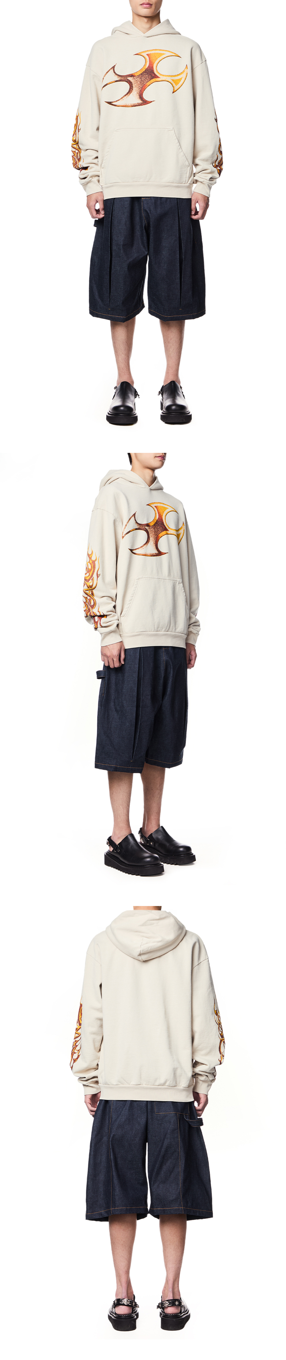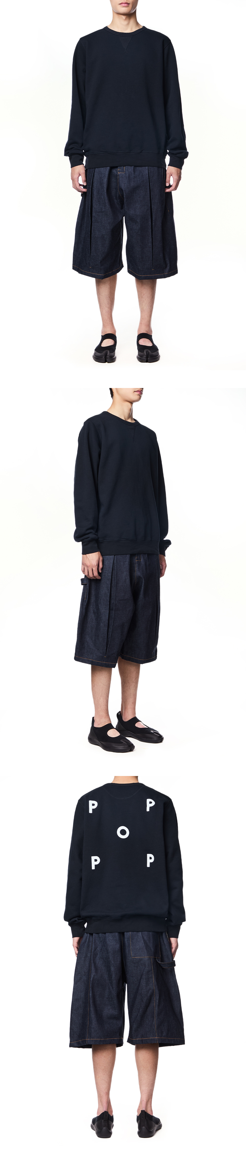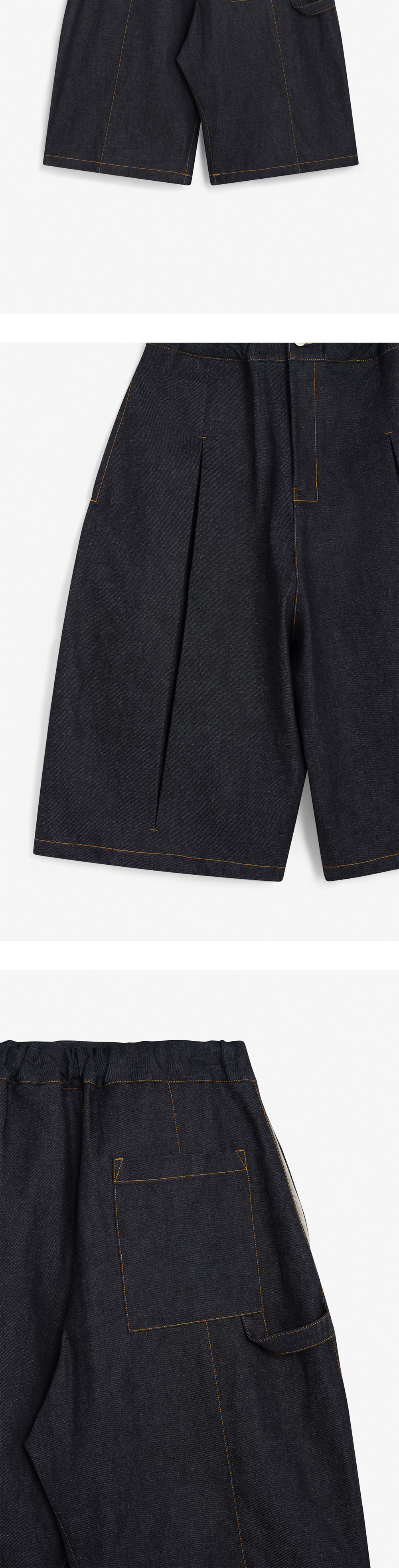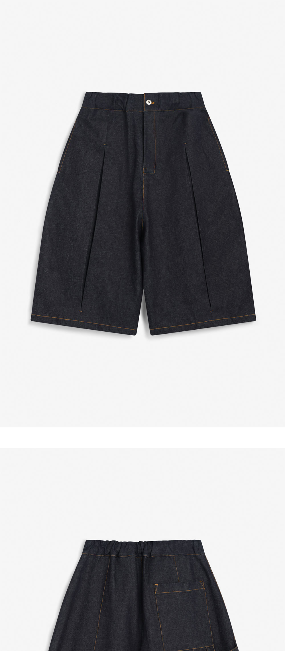 전면의 박스 플리츠와 해머루프가 특징인 세이지 네이션의 박스 플리츠 데님 쇼츠입니다. – 엘라스틱 허리 밴드 – 센터 박스 플리츠 - 1개의 레어 패치 포켓 *모델 신체 스펙 : 185cm / 착용 사이즈 : L