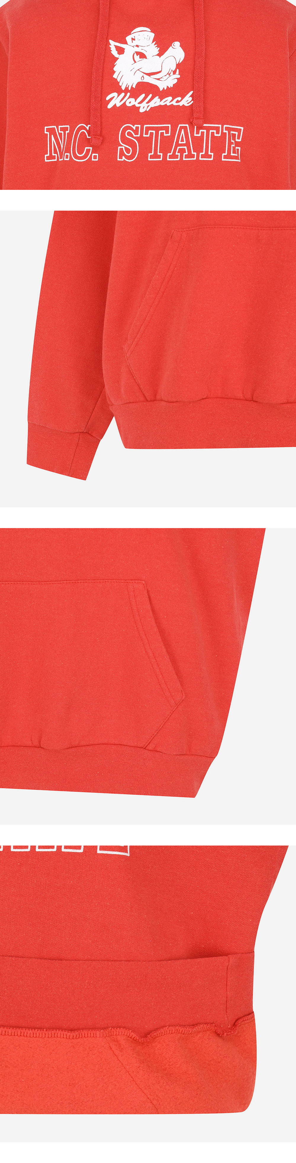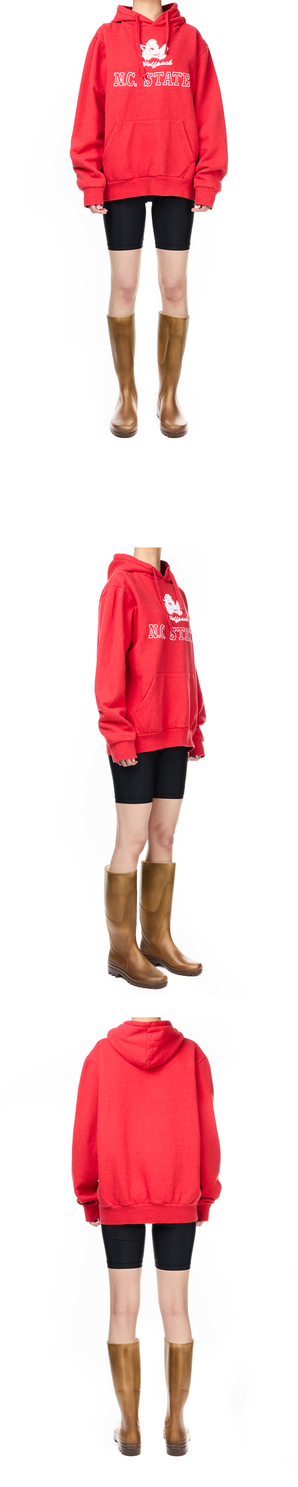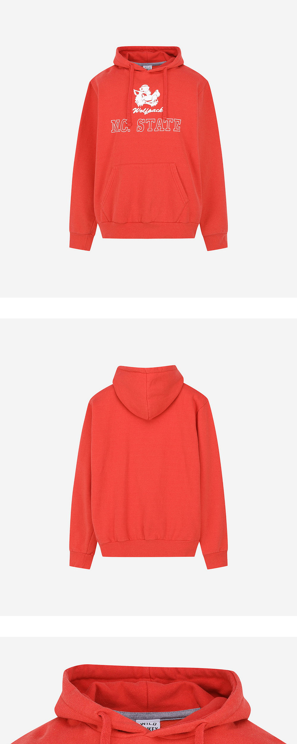 빈티지한 무드의 그래픽과 워싱이 특징적인 와일드 동키의 울프팩 후디입니다. - 빈티지 워싱 디테일 - 울프팩 캐릭터 그래픽과 'N.C. STATE' 레터링 * 모델 신체 스펙 : 170cm / 착용 사이즈 : L