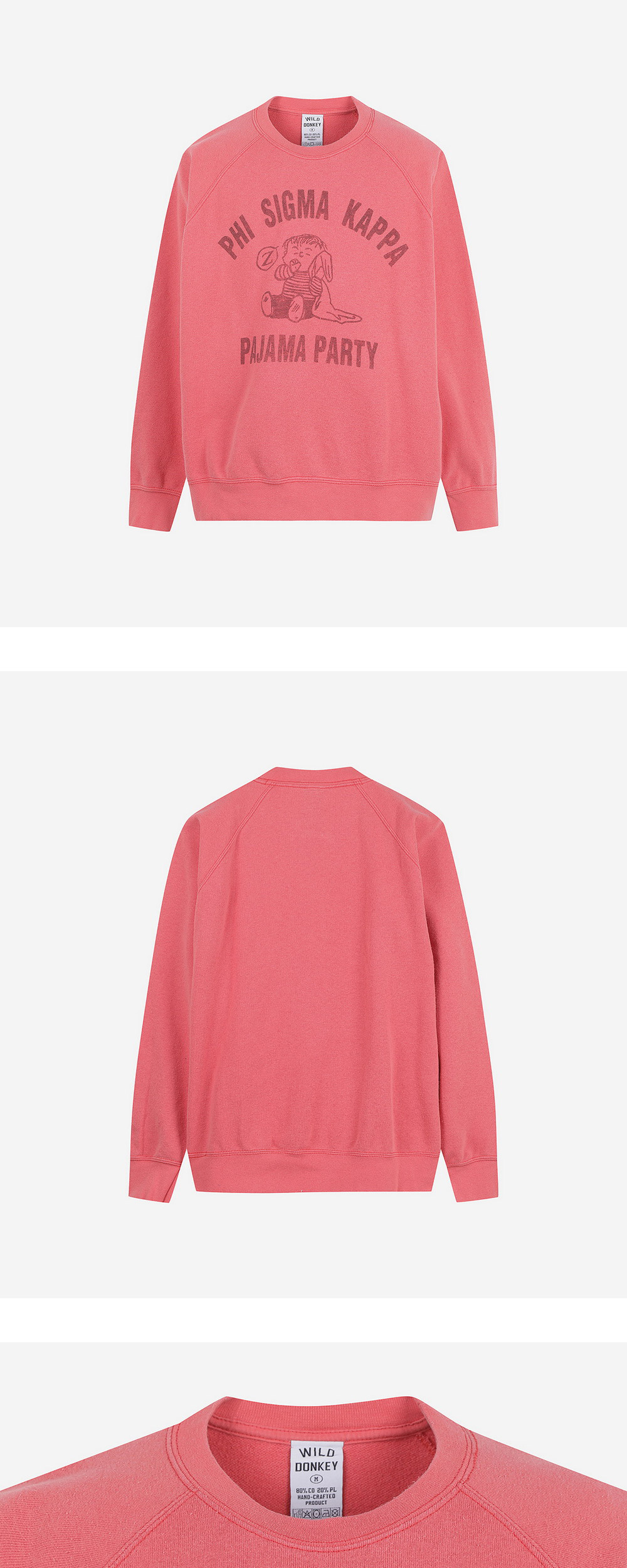 전면의 귀여운 그래픽이 돋보이는 와일드 동키의 파자마 스웨트셔츠입니다. - 코튼 및 폴리에스터 혼방 소재로 제작되어 쾌적한 착용감 - 빈티지 무드의 워싱과 귀여운 프린팅 디테일