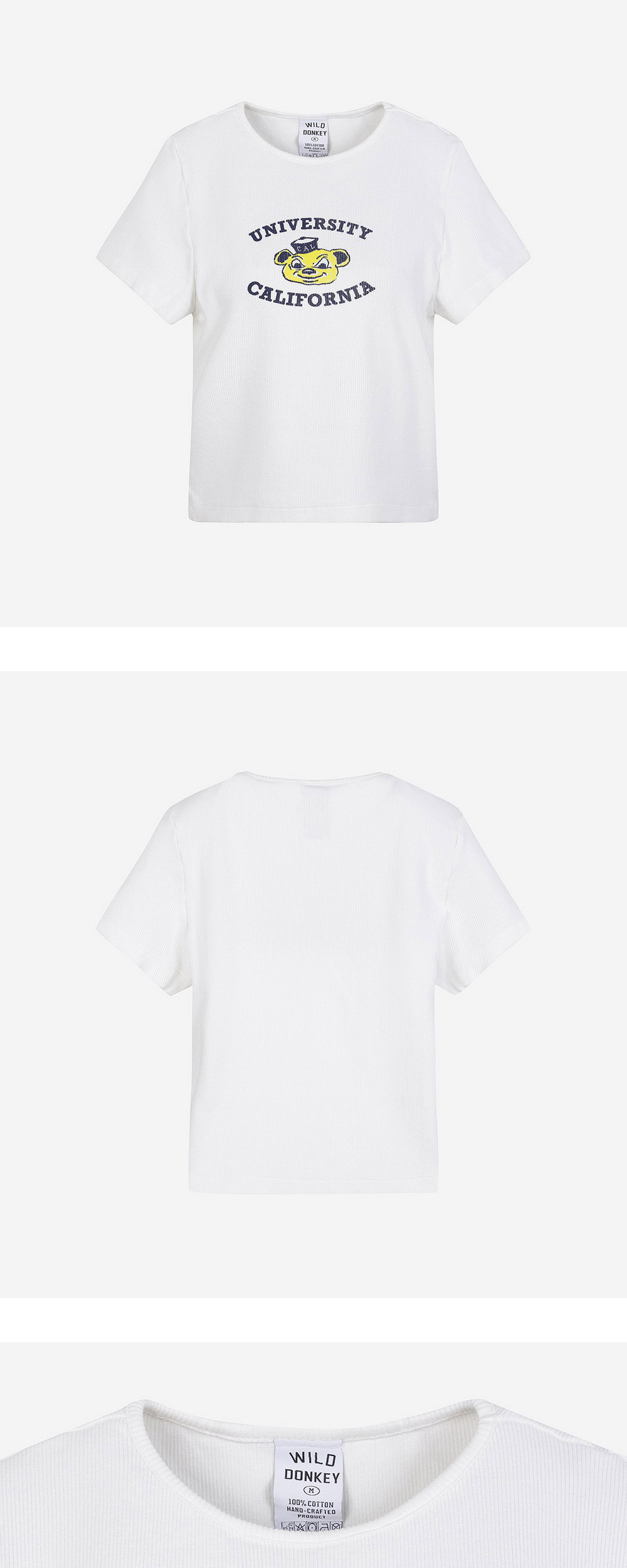 귀여운 그래픽 프린팅 디테일이 돋보이는 와일드 동키의 캘리포니아 티셔츠입니다. - 슬림 핏 & 크롭 길이 - 부드러운 면 소재로 제작되어 편안한 착용감 - 캘리포니아 대학교 레터링과 곰돌이 캐릭터 그래픽 * 모델 신체 스펙 : 170cm / 착용 사이즈 : S