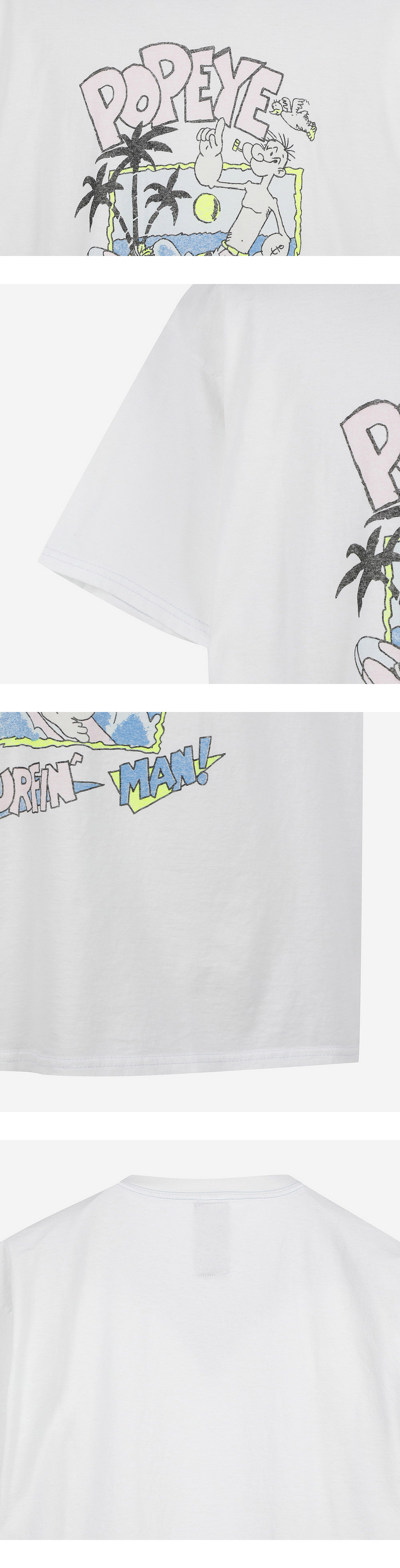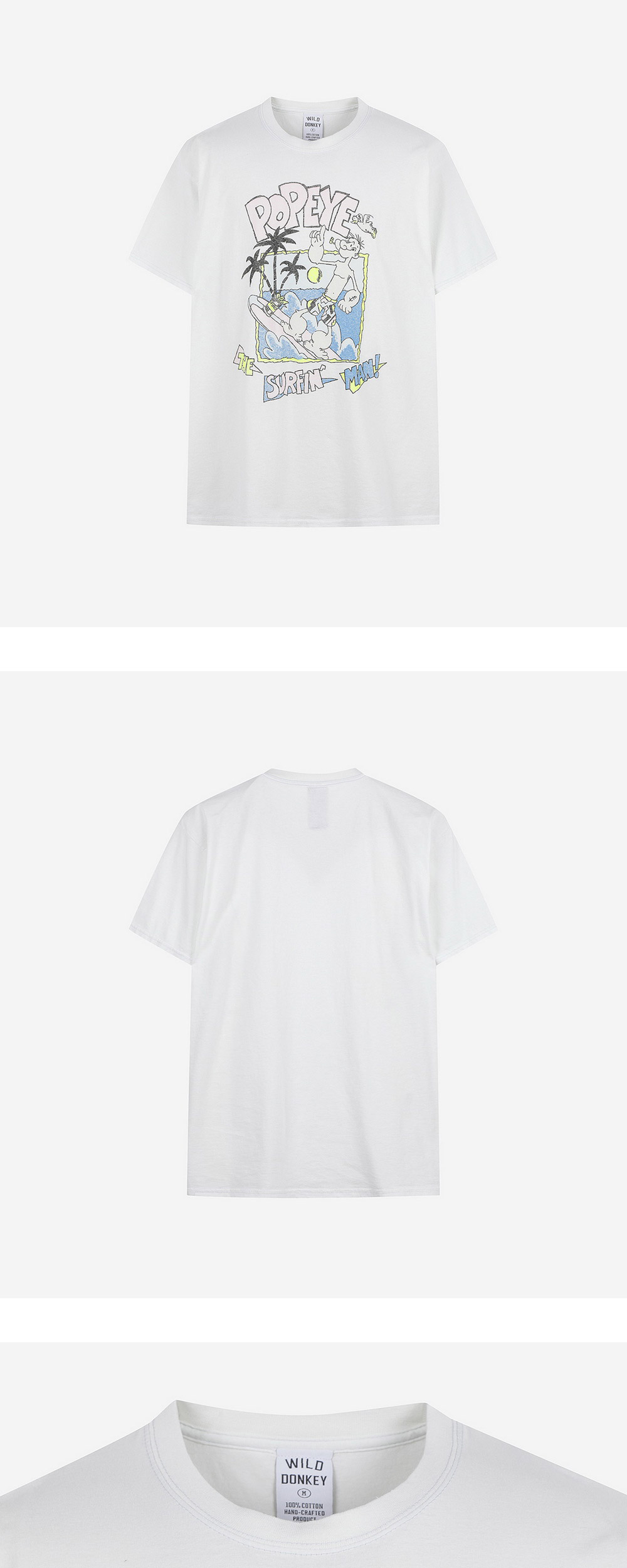 독특하고 예술적인 아트워크 프린팅이 돋보이는 와일드 동키의 서핑 맨 티셔츠입니다. - 부드러운 면 소재로 제작되어 편안한 착용감 - 하와이안 무드의 'Popeye' 카툰 스타일 그래픽