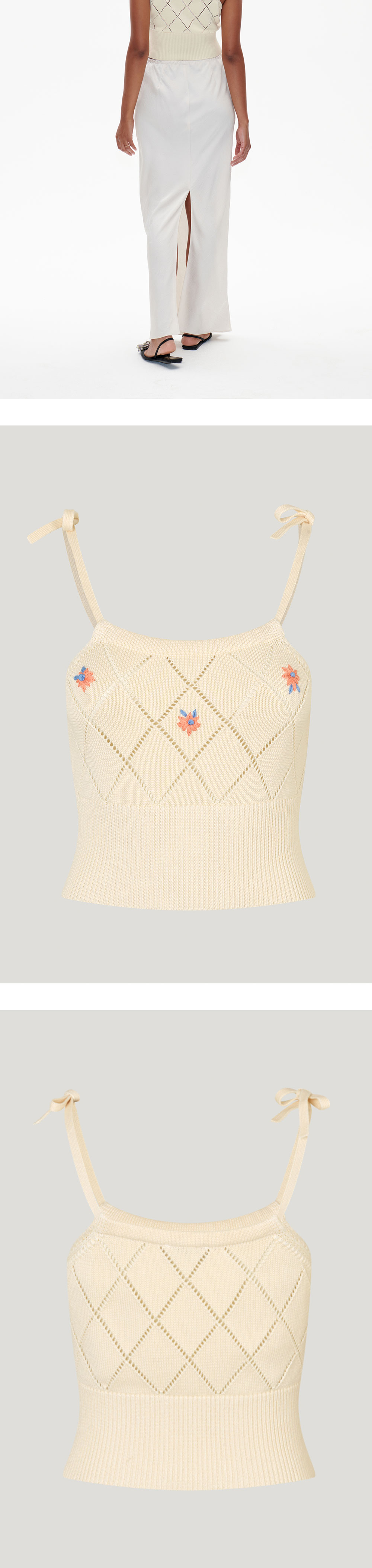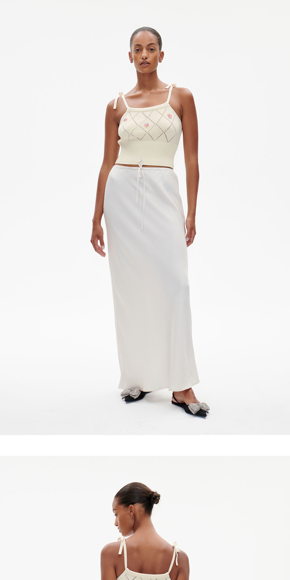 바움 운드 페르드가르텐의 쿠나 니트 탱크 탑은 리본 포인트 스트랩, 밑단의 립 니트, 그리고 조절 가능한 네크라인이 특징입니다. - 핏한 사이즈 * 모델 신체 스펙 177cm / 착용 사이즈 S