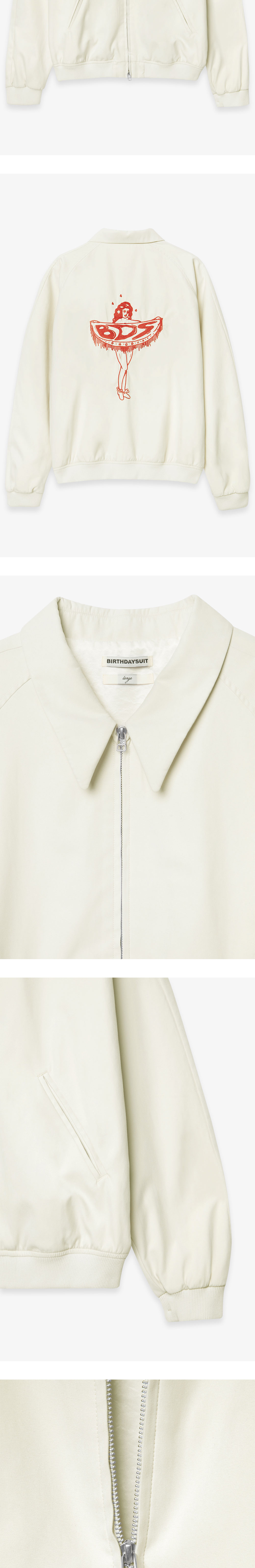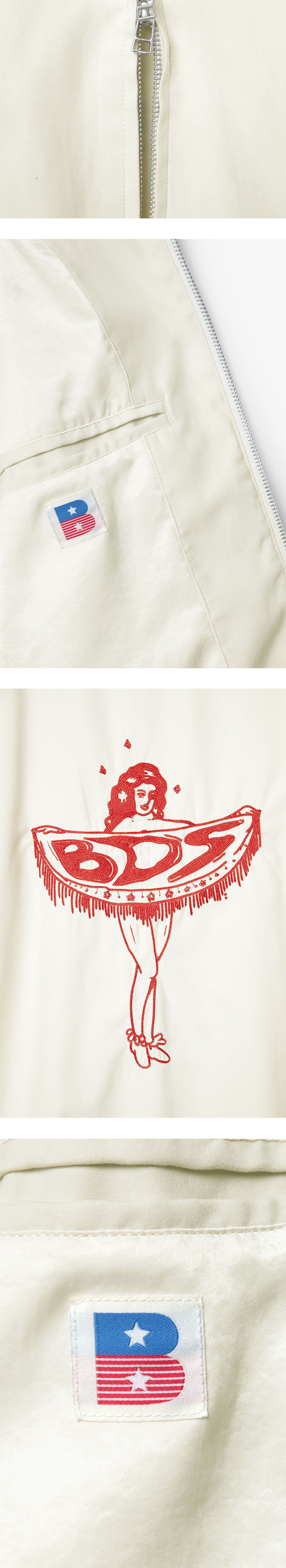 PIN UP GIRL SUKAJAN은 폴리에스터 나일론 혼방 소재로 제작된 스카잔 재킷으로 부드러운 텍스처가 돋보이는 아이템입니다. 래글런 소매의 여유로운 실루엣으로 전면 2-WAY 지퍼로 다양한 코디를 연출할 수 있으며, 여분의 물품을 수납할 수 있는 포켓으로 실용성을 더하였습니다. 후면은 벌스데이수트만의 시그니처 로고인 BDS에 여성의 형상을 띄고 있는 자수 그래픽으로 포인트를 주었으며, 소매와 밑단은 리브 조직으로 마감 처리하여 자연스럽게 실루엣을 잡아줍니다.