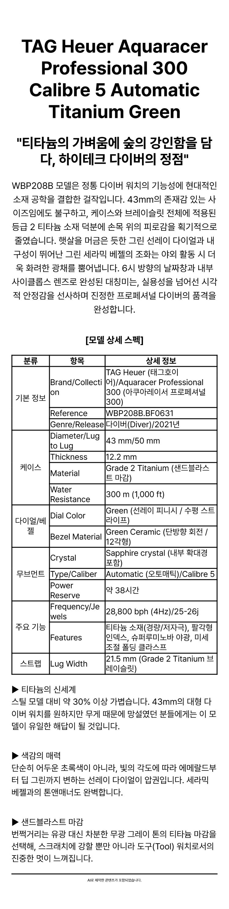 태그 호이어 아쿠아레이서 프로페셔널 300 칼리버 5 오토매틱 티타늄 그린