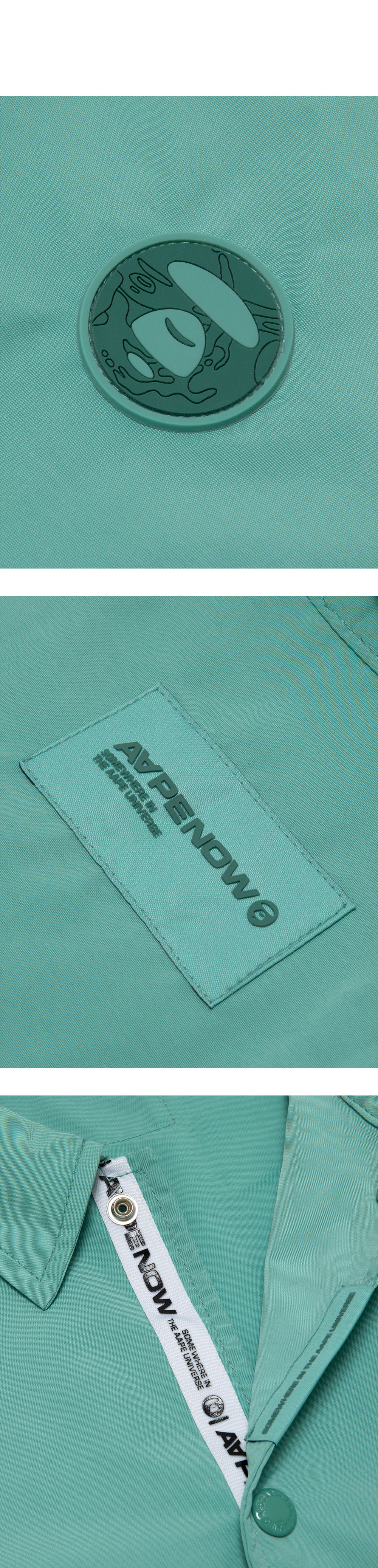 - 폴리에스테르 100% 소재의 코치 재킷 - 나일론과 유사한 질감과 부드러운 촉감, 얇고 가벼운 소재로 레이어드하기에 적합 - 왼쪽 가슴의 러버 패치와 목 뒤의 패치가 동일한 색상으로 세련되게 조합되어 있어 고급스러운 디자인 - 단추를 풀면 AAPE NOW 로고가 들어간 라인 테이프가 살짝 드러나는 재미있는 아이템 - 밑단에는 드로코드가 달려 있어 실루엣 변경 가능