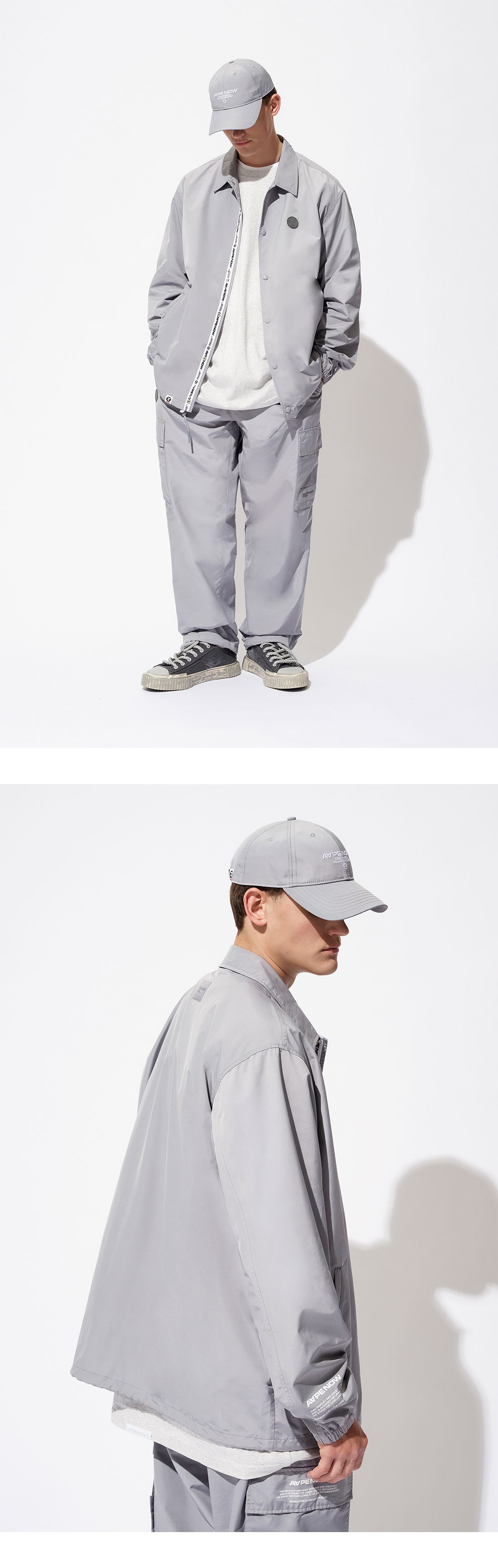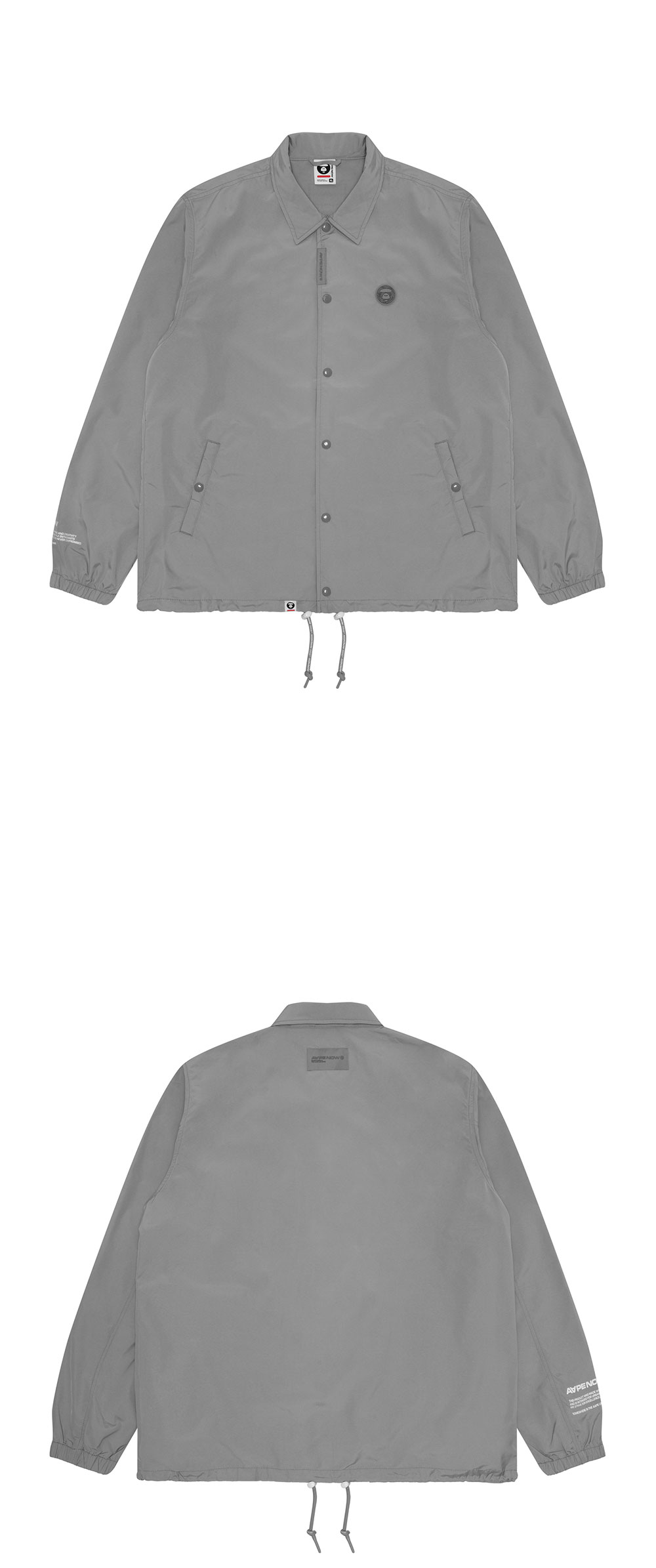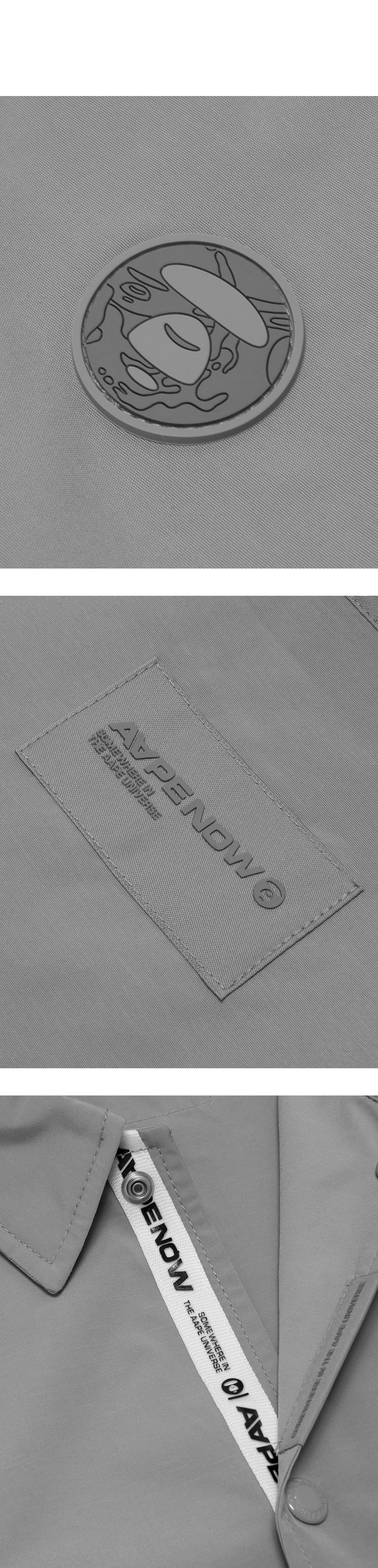 - 폴리에스테르 100% 소재의 코치 재킷 - 나일론과 유사한 질감과 부드러운 촉감, 얇고 가벼운 소재로 레이어드하기에 적합 - 왼쪽 가슴의 러버 패치와 목 뒤의 패치가 동일한 색상으로 세련되게 조합되어 있어 고급스러운 디자인 - 단추를 풀면 AAPE NOW 로고가 들어간 라인 테이프가 살짝 드러나는 재미있는 아이템 - 밑단에는 드로코드가 달려 있어 실루엣 변경 가능