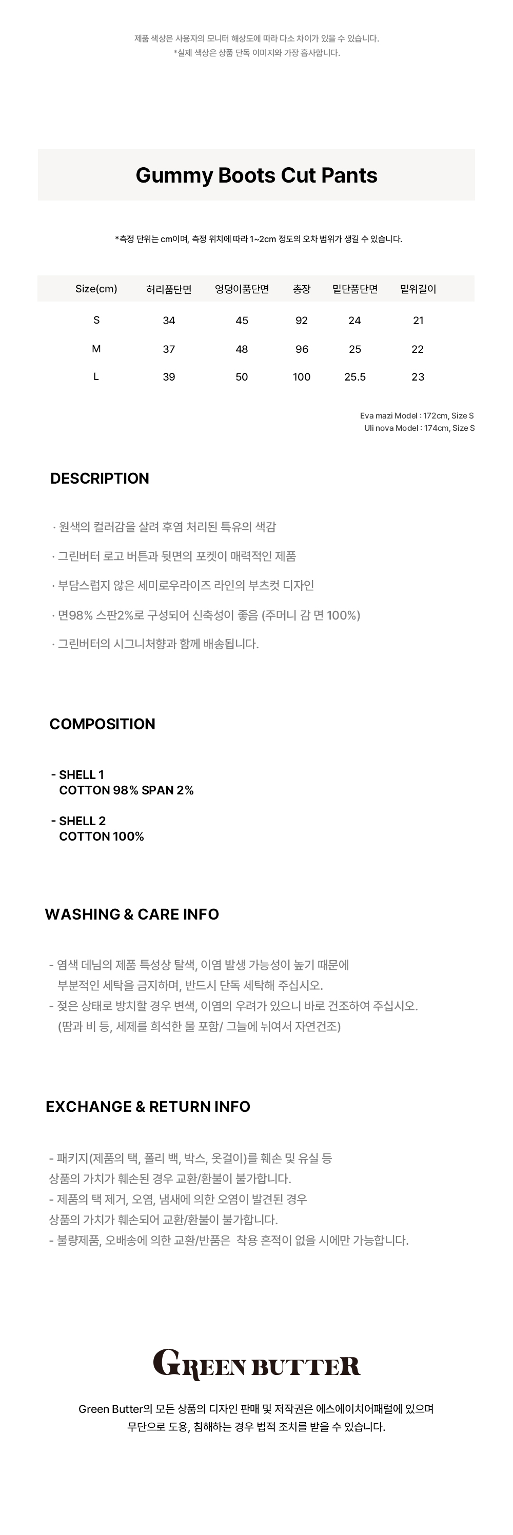 원색의 컬러감을 살려 후염 처리된 특유의 색감그린버터 로고 버튼과 뒷면의 포켓이 매력적인 제품부담스럽지 않은 세미로우라이즈 라인의 부츠컷 디자인면98% 스판2%로 구성되어 신축성이 좋음 (주머니 감 면 100%)그린버터의 시그니처향과 함께 배송됩니다.